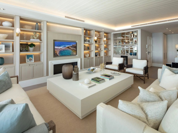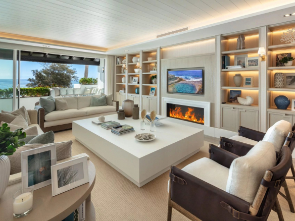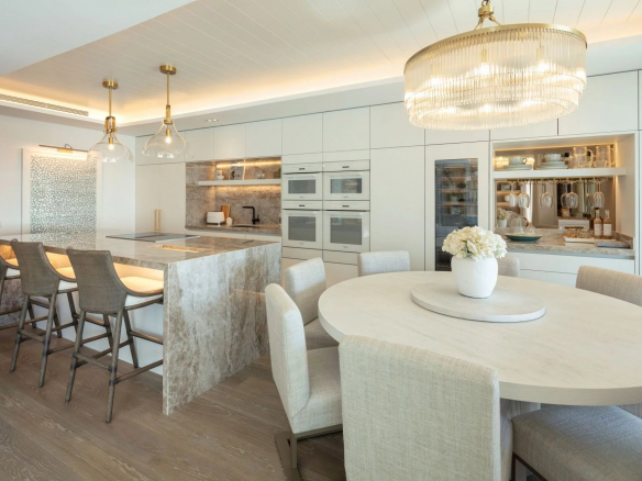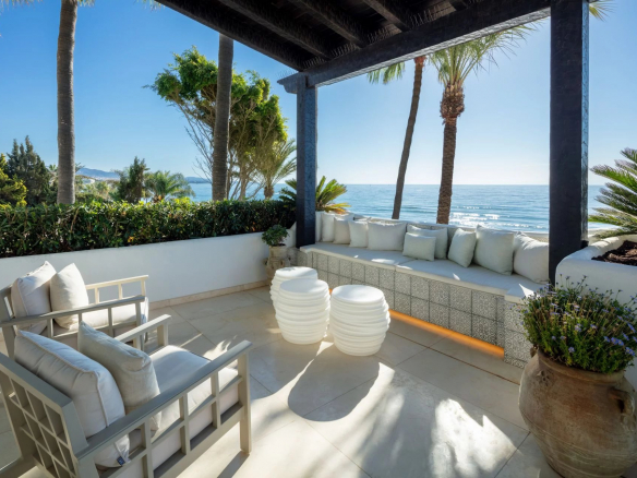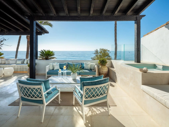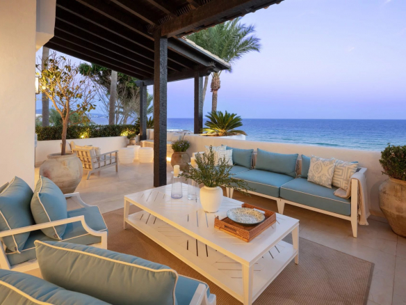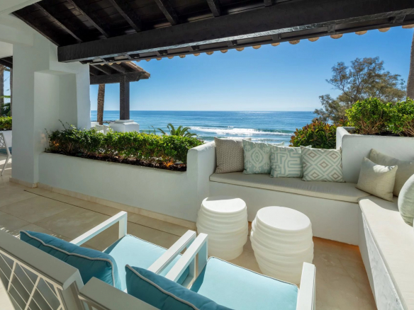 Papaya is a stunning duplex apartment situated in a highly sought-after beachfront location within the prestigious Puente Romano Resort. This exceptional property boasts breathtaking panoramic sea views overlooking the communal garden and our beloved coastline. Its south-facing orientation ensures that natural light floods the residence throughout the day, creating unparalleled sunrises and sunsets. Papaya offers an abundance of terrace space, ideal for al fresco dining and relaxation areas, perfect for those who appreciate the outdoors. The ground floor of the property maximizes the use of its outdoor spaces, allowing direct access to the terrace from all areas via floor-to-ceiling sliding glass doors. The interior of the property is truly stunning, elegantly adorned with neutral tones and touches of blue, reflecting the colors seen when looking out onto the terrace and towards the sea. The color palette evokes a sense of tranquility, while the layout offers both functionality and style. The living room is a true masterpiece, featuring a built-in library, a sophisticated bar, and a cozy fireplace, seamlessly connecting to the dining room and kitchen. The kitchen combines functionality and aesthetics, showcasing a stunning island adorned with exquisite marble and equipped with state-of-the-art appliances and a wine refrigerator. The two guest bedrooms, located on the ground floor, boast impeccable interior design and en-suite bathrooms. The upper level of the property is dedicated to the opulent master suite. Featuring a private sitting area with a fireplace, the master bedroom offers an elegant walk-in closet, a spacious ensuite bathroom, and an incredible private terrace that opens onto the entire master suite. The main terrace not only offers breathtaking views and a serene space for relaxation but also features a captivating swimming pool overlooking the sparkling sea. With its exceptional location, luxurious interiors and generous terraces, this property presents a remarkable opportunity to indulge in the prestigious seaside lifestyle of Marbella.