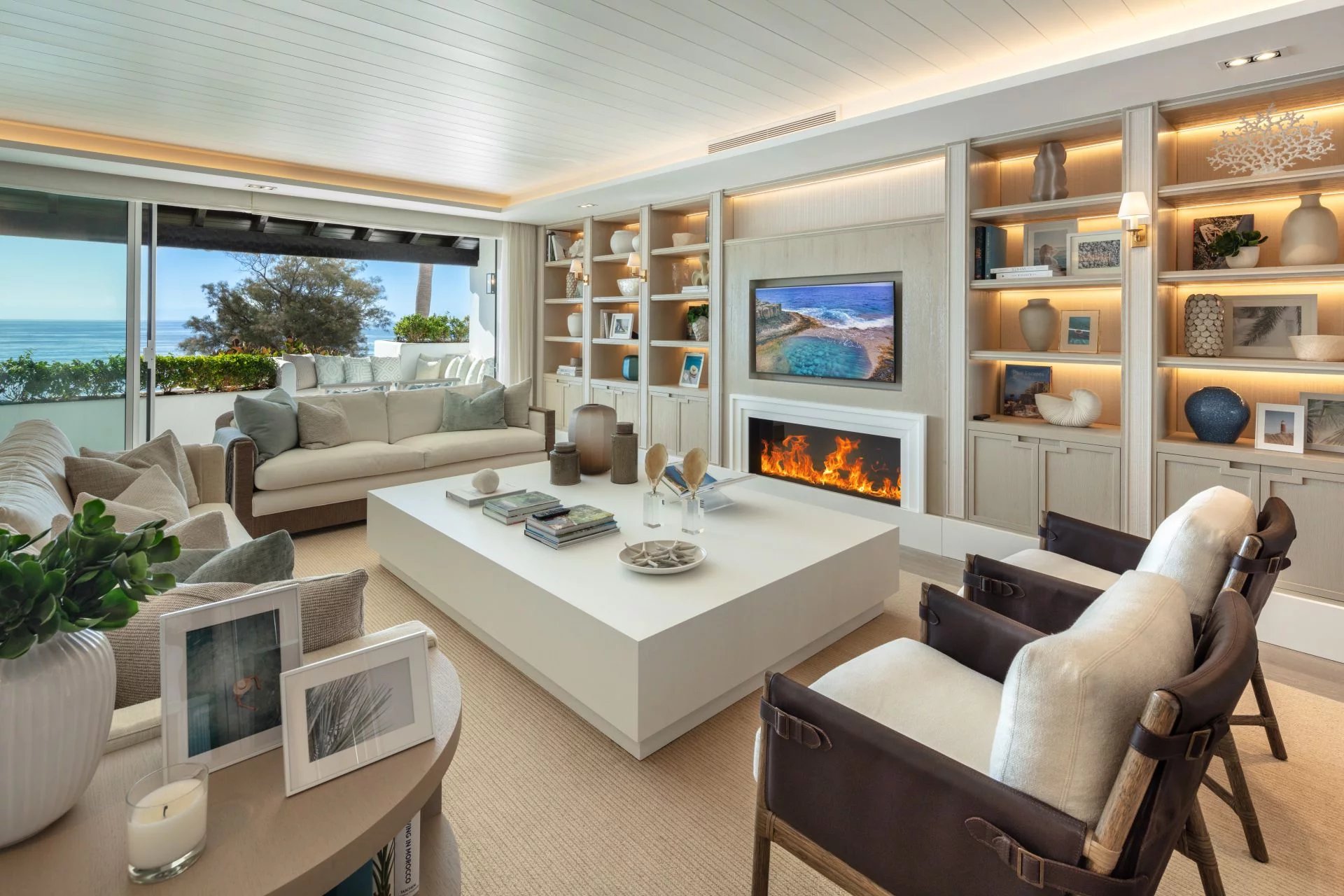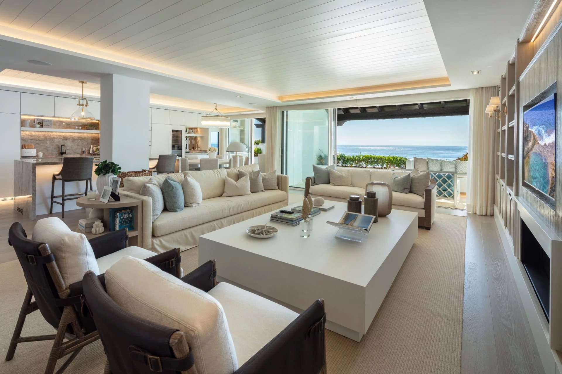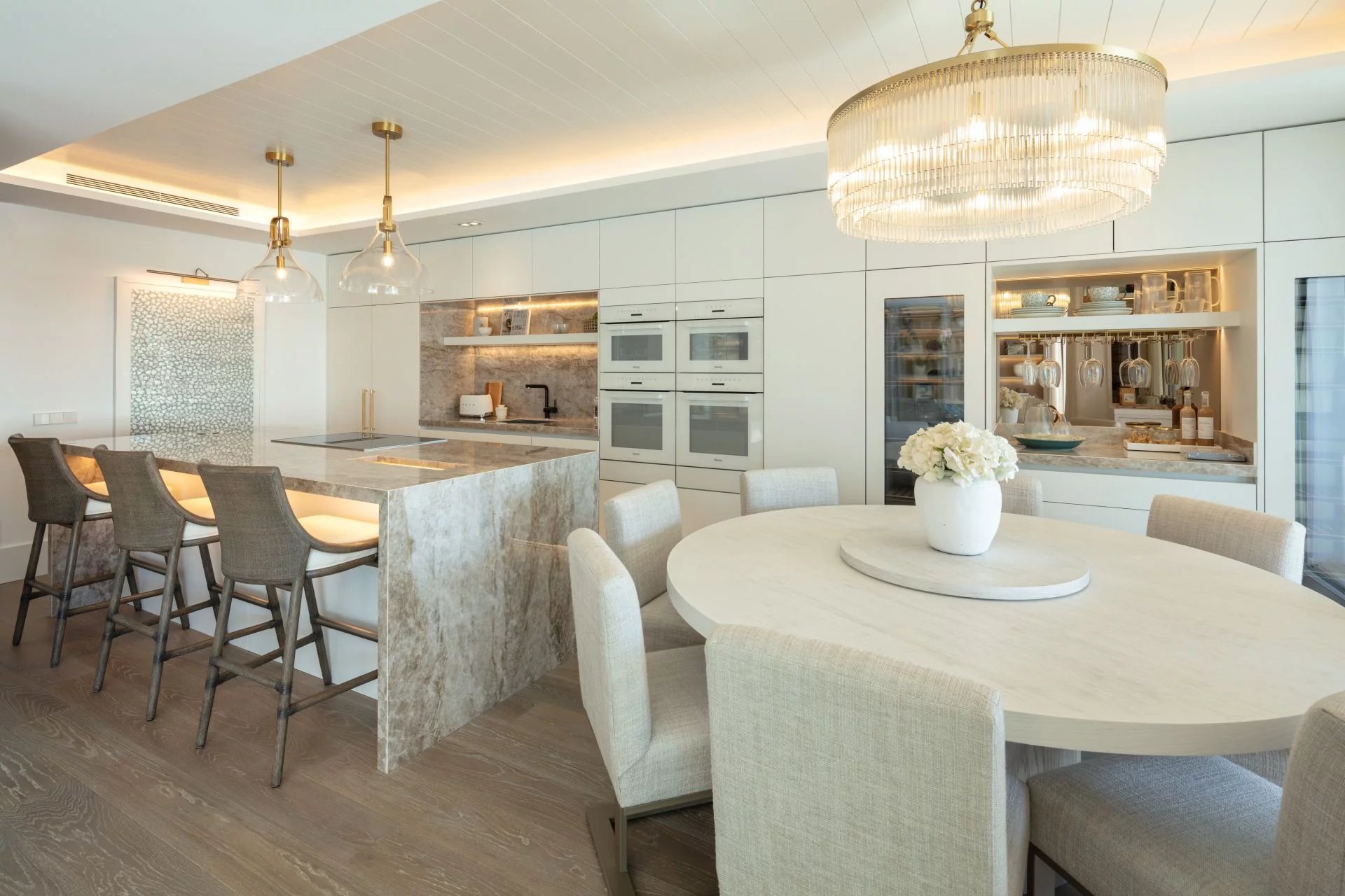 Papaya is a stunning duplex apartment located in a highly sought-after frontline beach location within the prestigious Puente Romano Resort. This exceptional property offers breathtaking panoramic sea views, overlooking the community garden and our beloved coastline. Its south orientation ensures that natural light bathes the residence throughout the day, creating unprecedented sunrises and sunsets. Papaya offers an abundance of patio space, ideal for al fresco dining and relaxation areas, for those who enjoy the outdoor lifestyle. The ground floor of the property maximizes the use of its outdoor spaces, allowing direct access to the terrace from all areas through floor to ceiling sliding glass doors. The interior of the property is truly stunning, elegantly decked out in neutral tones and pops of blue, reflecting the colors seen when looking towards the terrace and the sea. The color palette evokes a sense of tranquility, while the layout offers both functionality and style. The living room is a true masterpiece, with a built-in bookcase, sophisticated bar and cozy fireplace, connecting seamlessly to the dining room and kitchen. The kitchen combines functionality and aesthetics, showcasing a stunning kitchen island adorned with exquisite marble and equipped with state-of-the-art appliances and a wine refrigerator. The two guest bedrooms, located on the ground floor, benefit from impeccable interior design and private bathrooms. The upper level of the property is dedicated to the opulent master bedroom. Featuring a private living room with a fireplace, the master bedroom offers an elegant walk-in closet, a spacious adjoining bathroom and an incredible private terrace that opens onto the entire master suite. The main terrace not only offers stunning views and a serene relaxation space, but also features a captivating swimming pool overlooking the sparkling sea. With its exceptional location, luxurious interiors and generous terraces, this property presents a remarkable opportunity to indulge in Marbella's prestigious beachfront lifestyle.