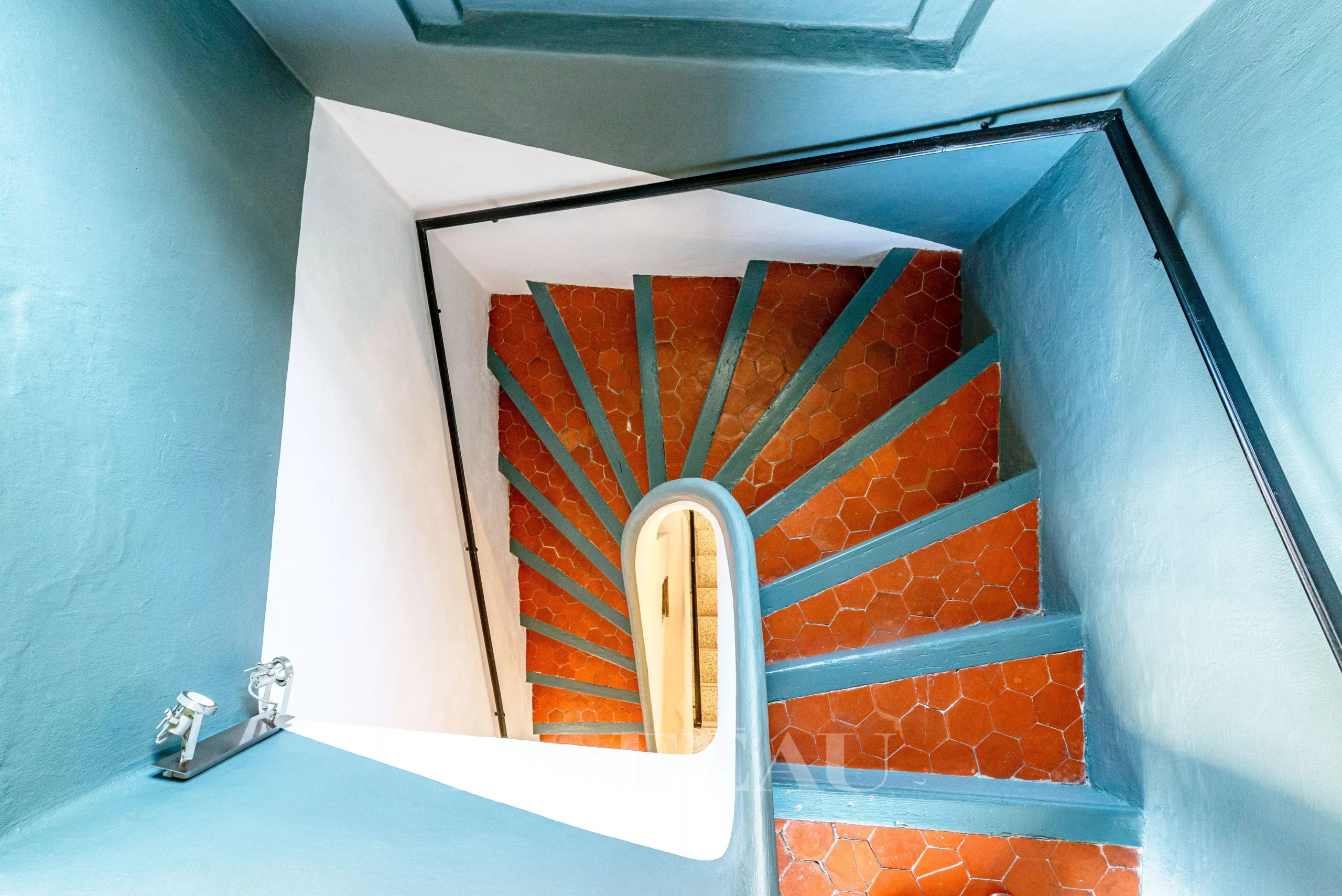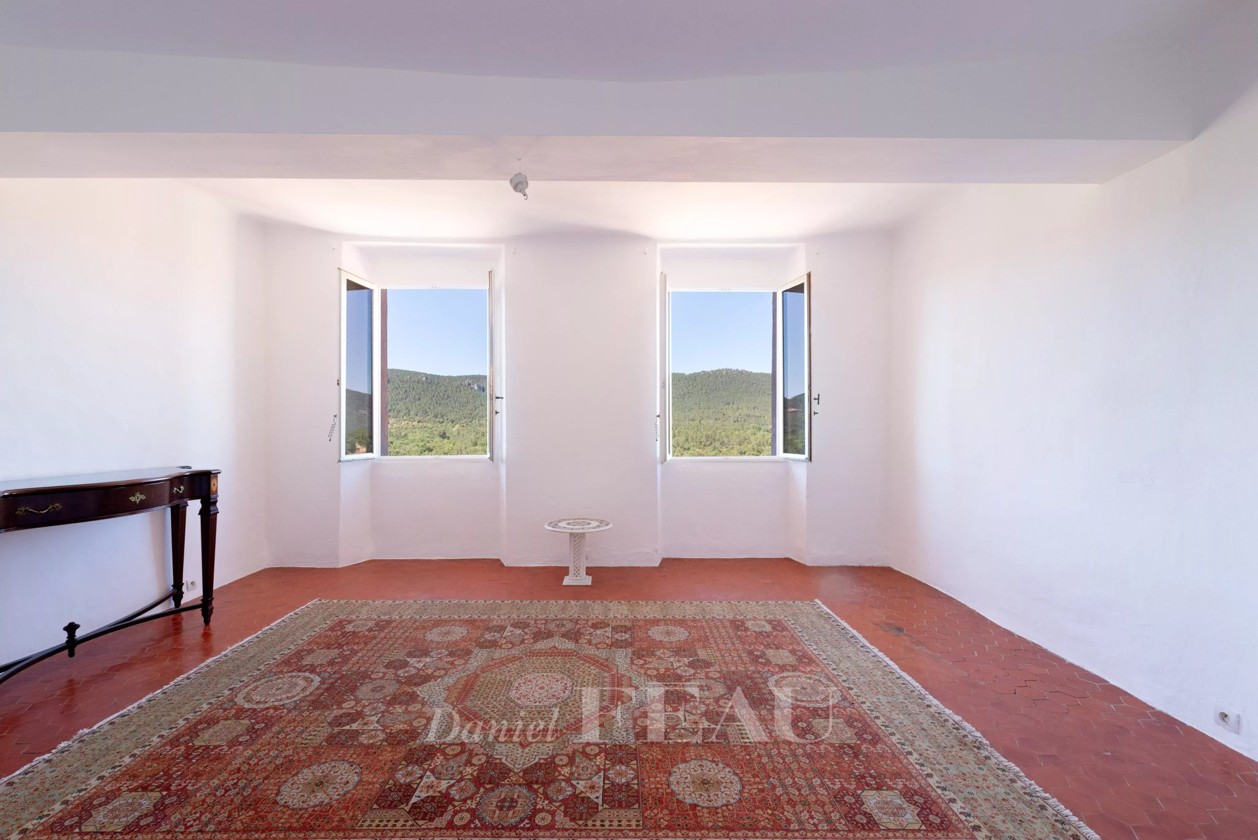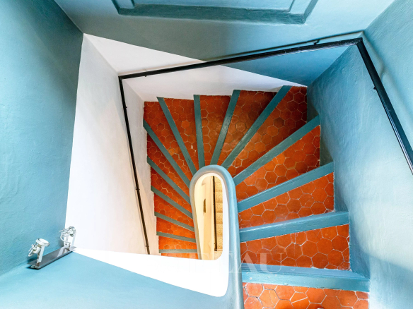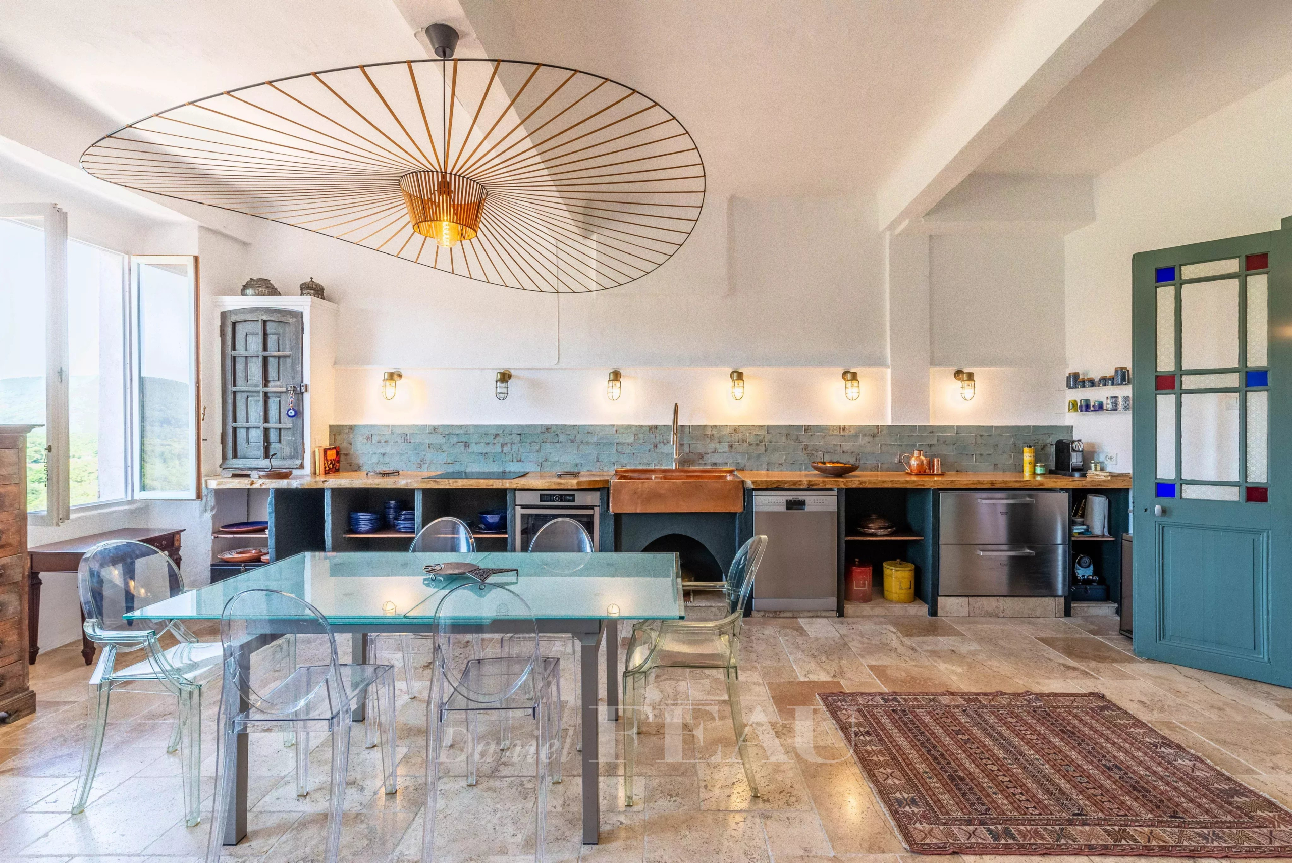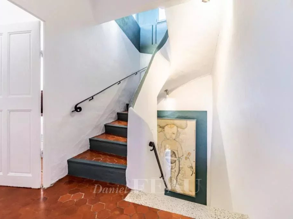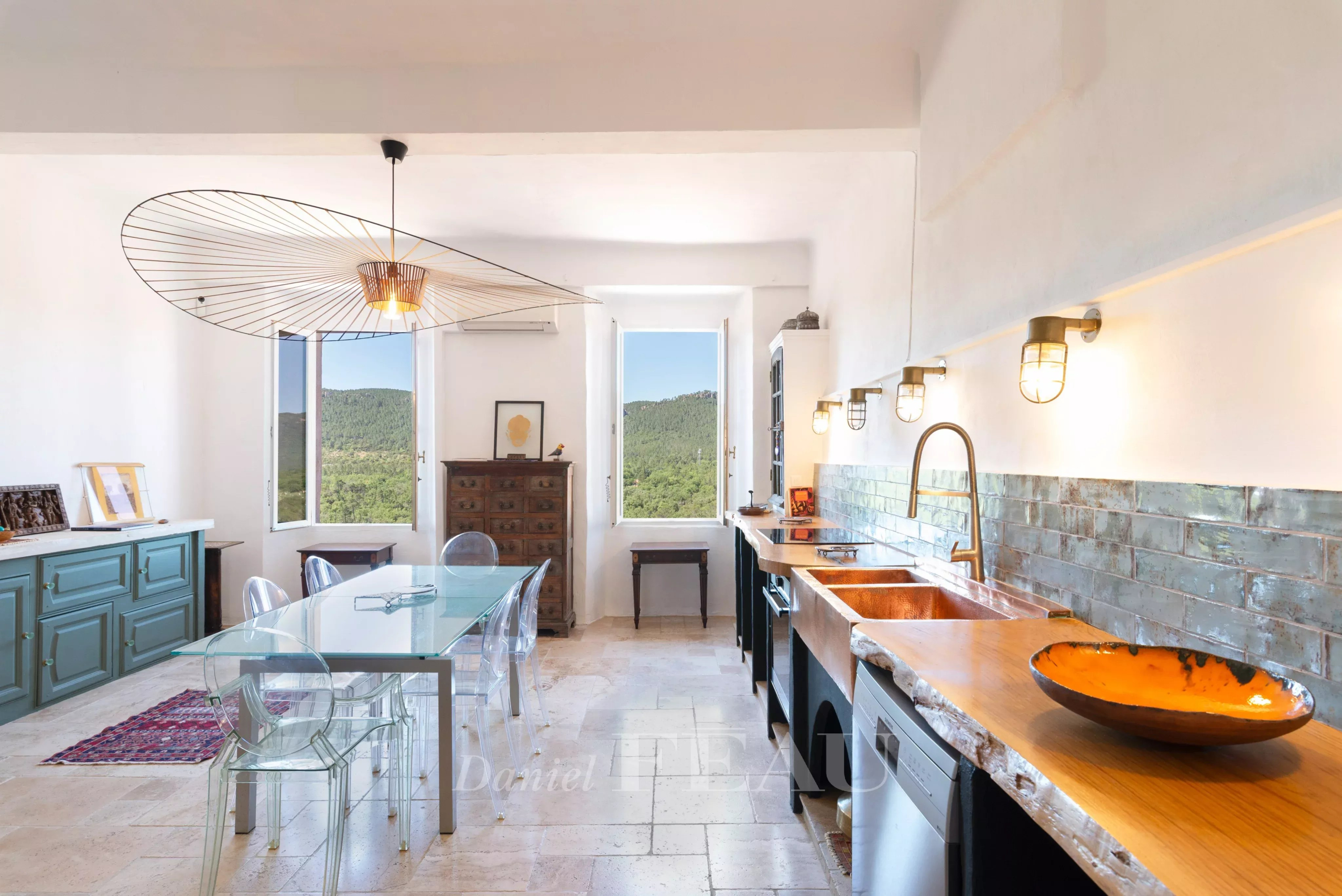 On the ground floor, double stained-glass doors from the 19th century open onto a spacious and bright living area, with a beautiful high ceiling, comprising the kitchen and dining room with an unobstructed view of the hills that separate Bagnols-en-Forêt from the Mediterranean.