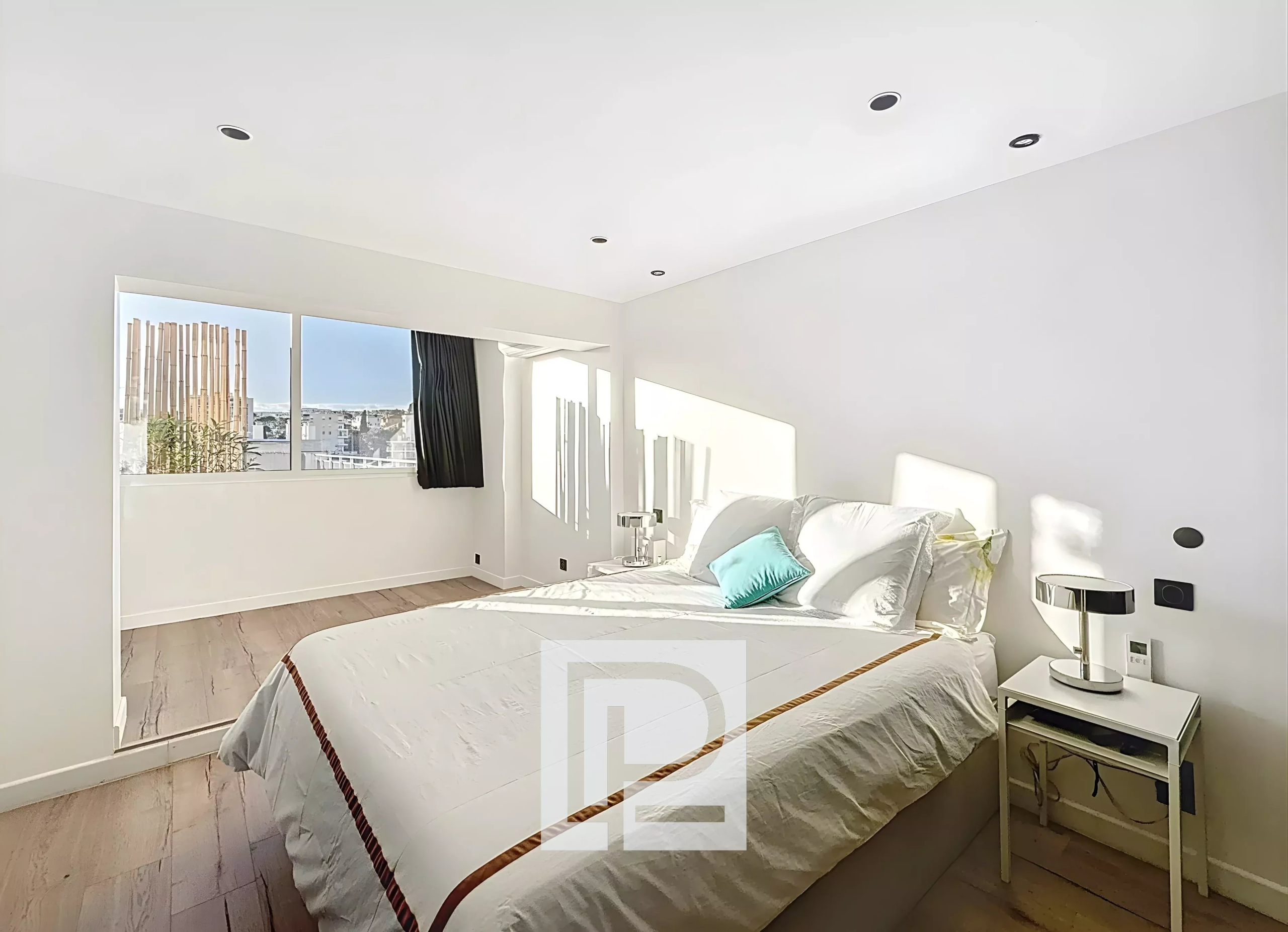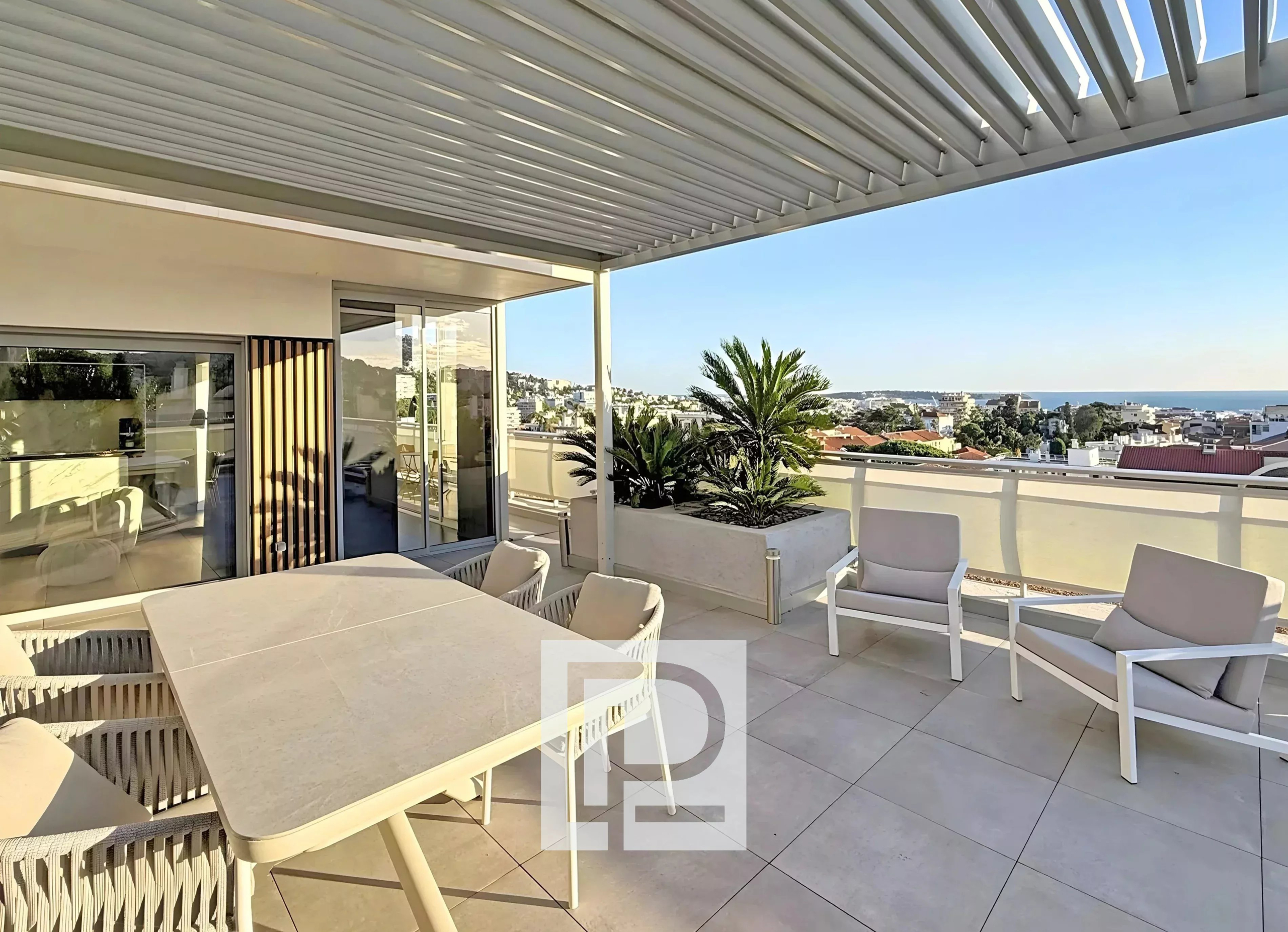 The apartment offers 98m² of living space and extends onto a fully furnished 70m² terrace with panoramic views of the sea and California. It comprises
