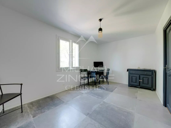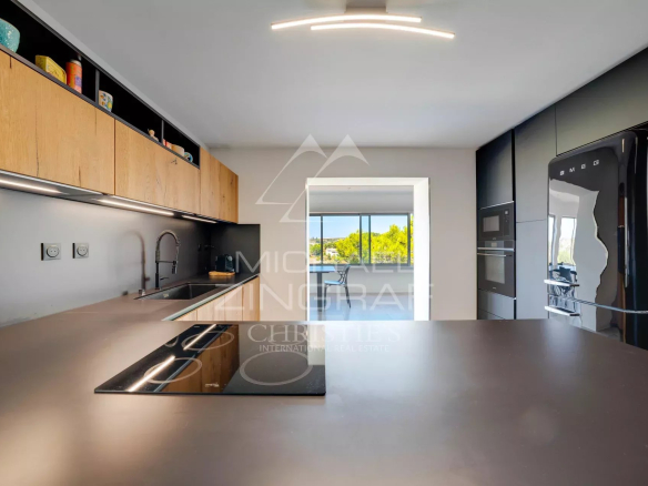 Outside, three terraced gardens extend the lifestyle overlooking the sea, complete with a summer kitchen, gym, and five-person jacuzzi. Comfort is further enhanced by a detached double garage, ample parking, a pétanque court, and generous storage space.