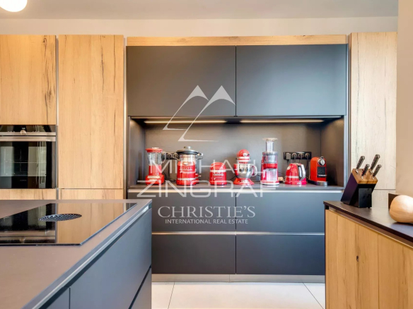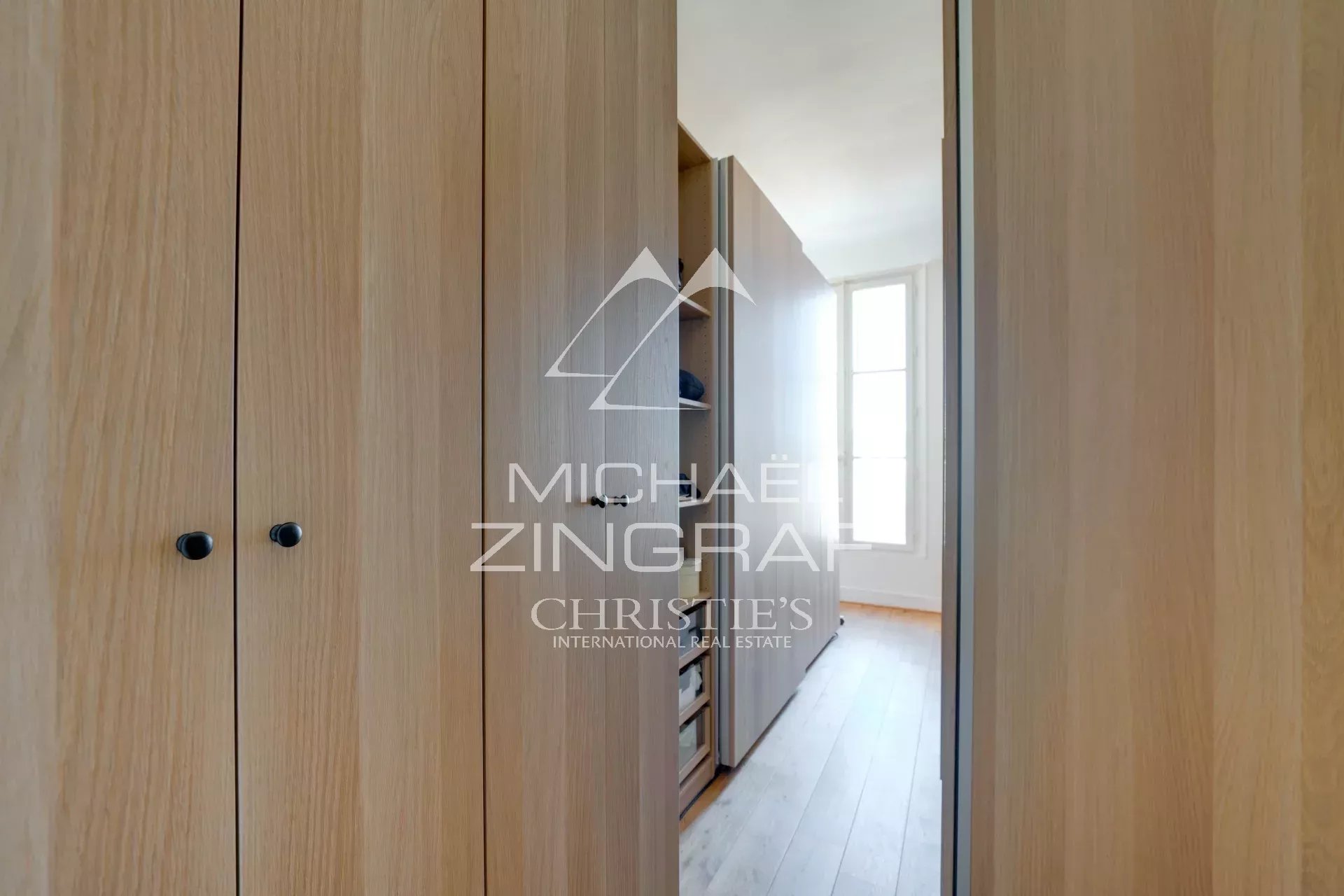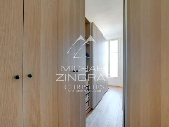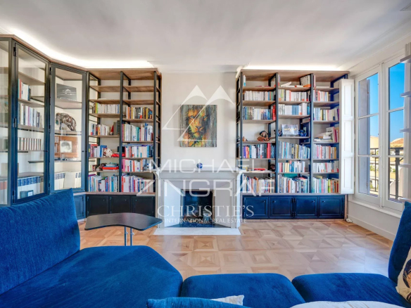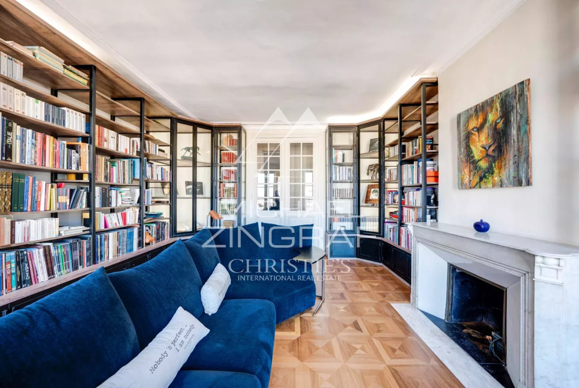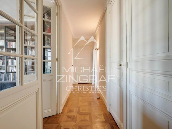 The apartment offers six rooms, including a spacious reception room, a custom-designed library space, three bedrooms, a dressing room, two elegant bathrooms and a perfectly fitted laundry room.