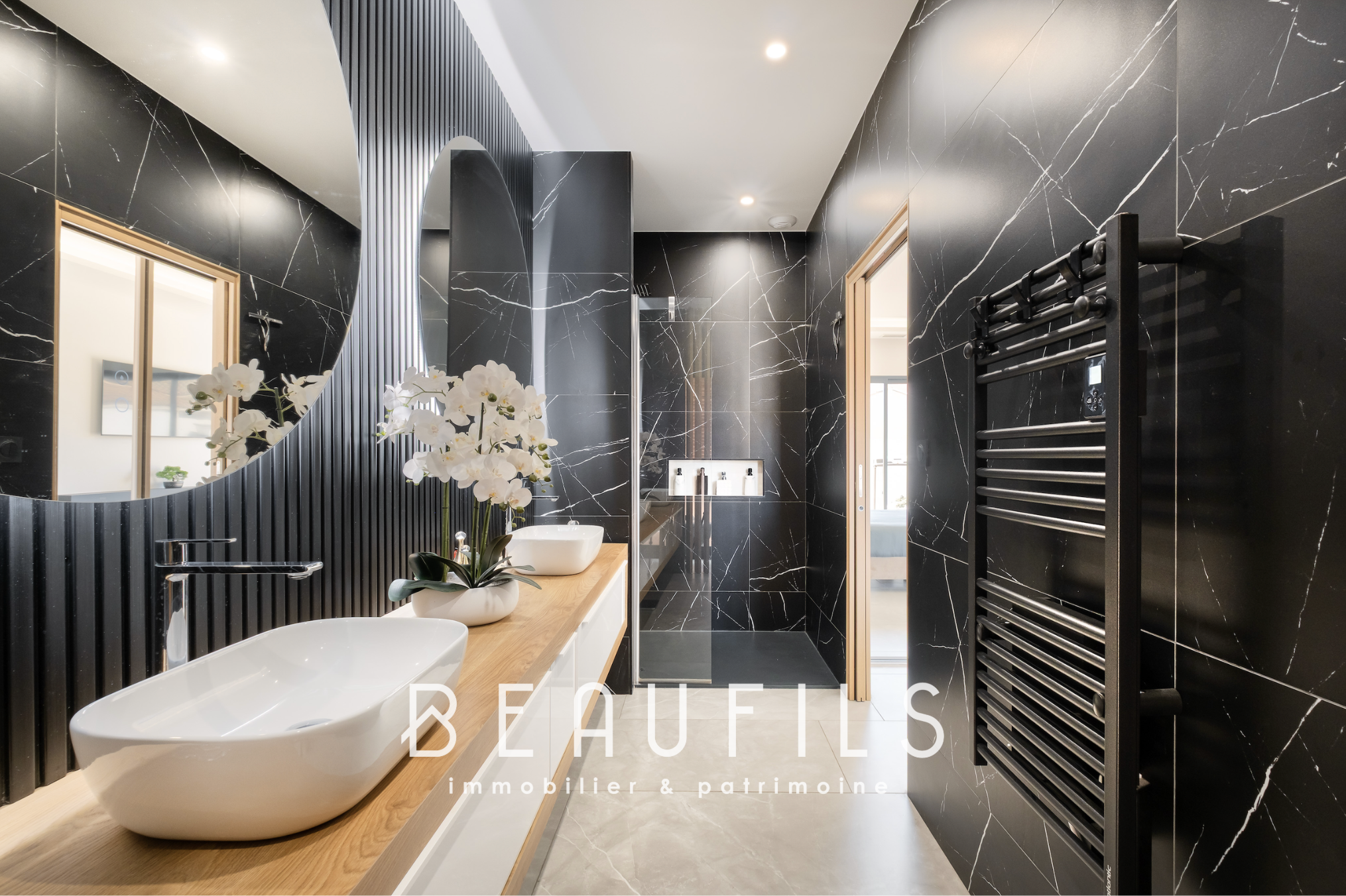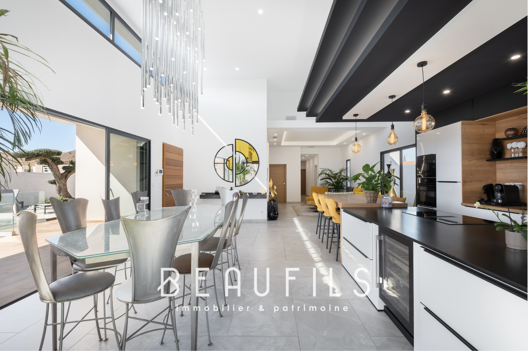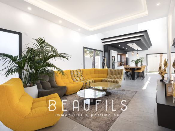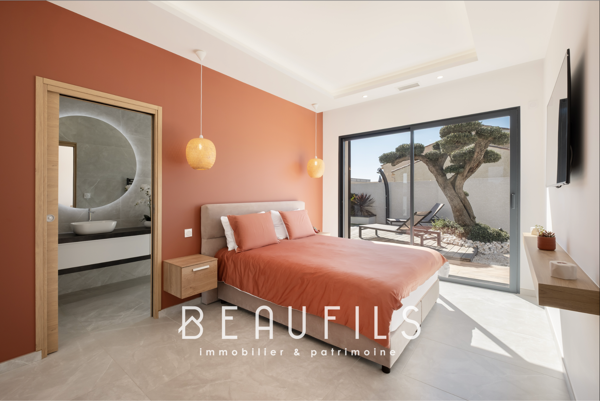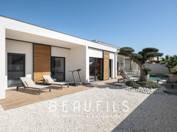Vias – Just 8 minutes from Grau d'Agde and 40 minutes from Montpellier, discover this contemporary villa, sold fully furnished, offering 157 sq m of living space on a single level, set on a landscaped 737 sq m plot, completely private and secluded. Designed with a resolutely contemporary aesthetic, the property impresses with its spaciousness and a 72 sq m living room enhanced by a 4.5-meter high ceiling, opening generously onto the outdoors, offering a true indoor/outdoor lifestyle. The custom-designed and fully equipped kitchen blends seamlessly into this bright reception area, which overlooks the garden and swimming pool. The sleeping area comprises three independent suites, complemented by a laundry room and premium features including large-format 60 x 120 cm tiles. The property boasts state-of-the-art equipment: ducted air conditioning, automated home heating, centralized roller shutters, a thermodynamic water heater, and a water softener, all covered by ten-year warranties. The meticulously landscaped exterior extends the villa with a garden, a heated 8 x 3.5 m in-ground swimming pool, several relaxation areas, three private parking spaces, and a 20 m² garage. Full details available upon request. Contact: Anthony Fages – +33 7 71 15 70 03. Agency fees payable by the seller – RCS 831 872 304 www.xbimmoinvest.com/honoraires.pdf