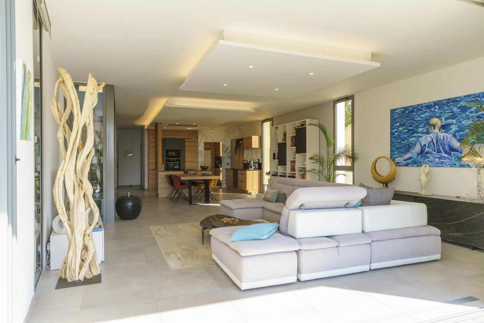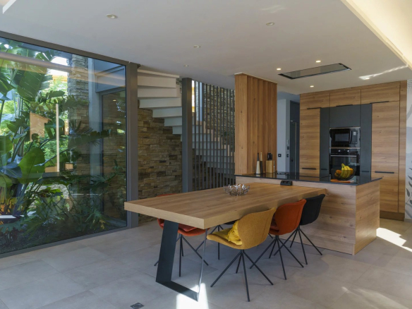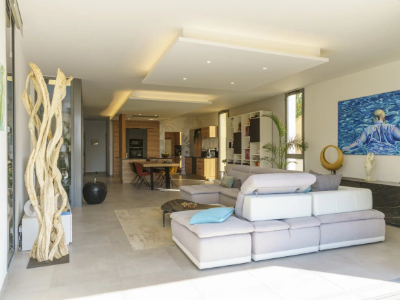 Spacious, bright living room with open-plan kitchen, overlooking a tropical garden