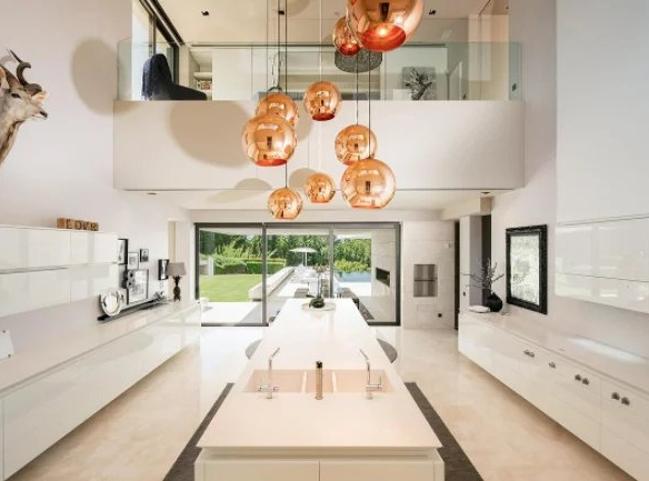 The expansive 3,152 m² villa captivates with its innovative design, elegant geometric lines, and subtle visual details that never become superfluous. The designer's skillful manipulation of space and light creates a seamless flow of living areas and a fluid, open layout. Modern technology controls everything from lighting and audiovisual systems to access and a range of advanced home automation systems. Splashes of light and gilded decorative pieces add a touch of luxury to the fashionable contemporary color palette; collectible art and decorative objects lend glamour and chic; and an eclectic mix of natural materials, leather, glass, and metallic elements provides a captivating contrast. The light globes are designed by Tom Dixon, whose works have been acquired by museums worldwide.