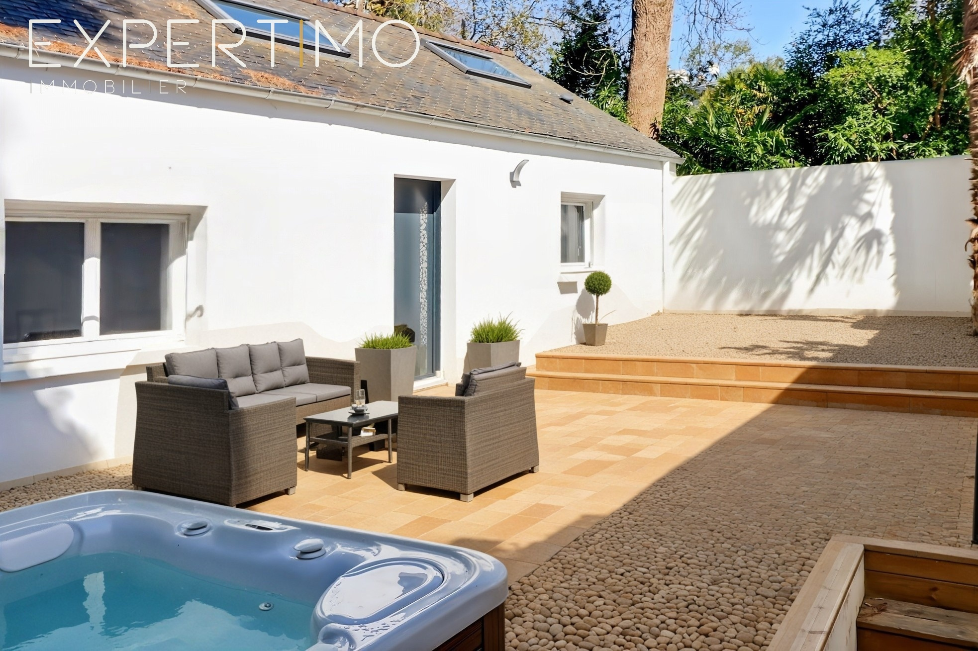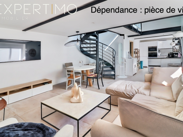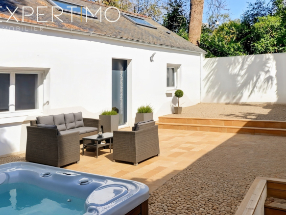 Hidden from view, the exterior spaces have been designed as a true haven of relaxation. A seamlessly integrated wooden terrace houses a wellness area with a jacuzzi, creating an intimate and secluded atmosphere. The meticulously landscaped garden blends a walled vegetable patch, outbuildings, and living spaces, offering a setting that is both elegant and functional.