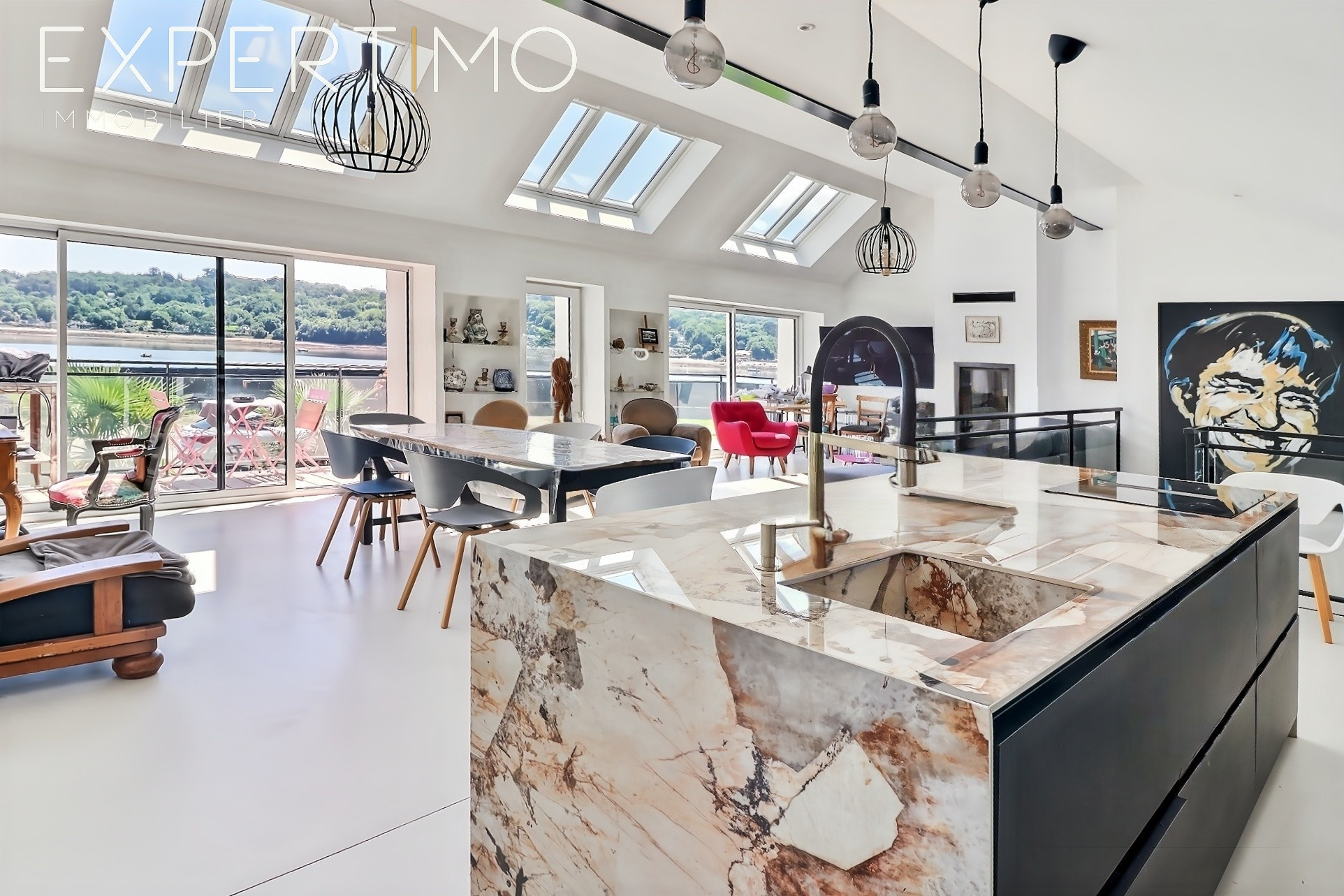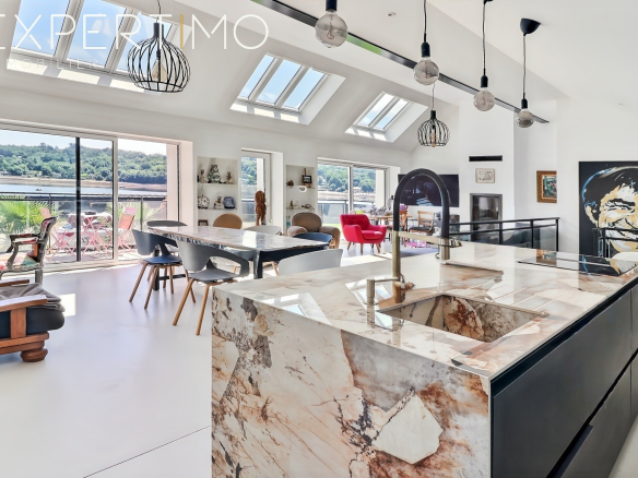 The upper floor houses the reception areas, intentionally positioned on a raised platform to take in the panoramic views. The generously proportioned living room opens onto a continuous balcony through expansive French doors. Light floods in, and the spectacular view unfolds unobstructed from the Plougastel bridge to the Cale passage. A contemporary fireplace defines the living area, while the elegantly integrated kitchen features a central island and high-end appliances.