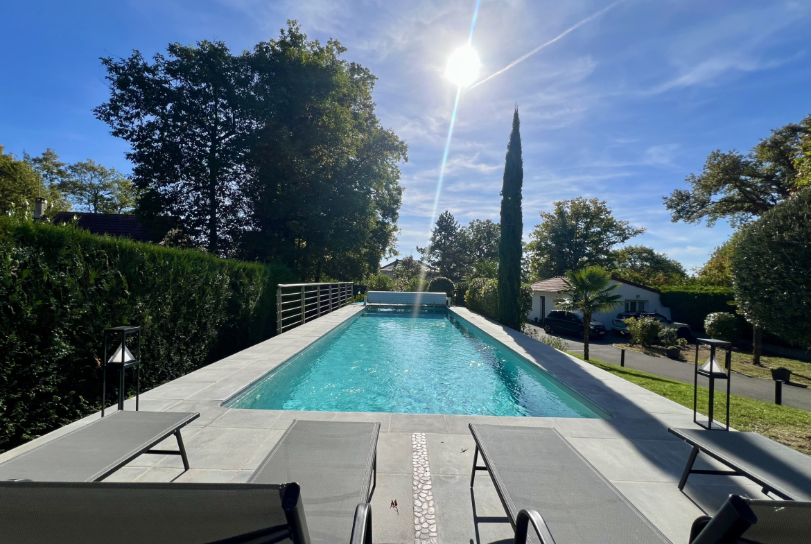 , providing privacy, coolness, and a unique character to the property. The pond with its koi carp completes this ensemble, creating a Zen and soothing atmosphere, ideal for relaxation and family time. The swimming pool is perfectly integrated into the natural environment, a true living space in its own right, inviting relaxation and convivial moments where one can fully enjoy the beautiful weather, surrounded by nature, calm, and serenity.