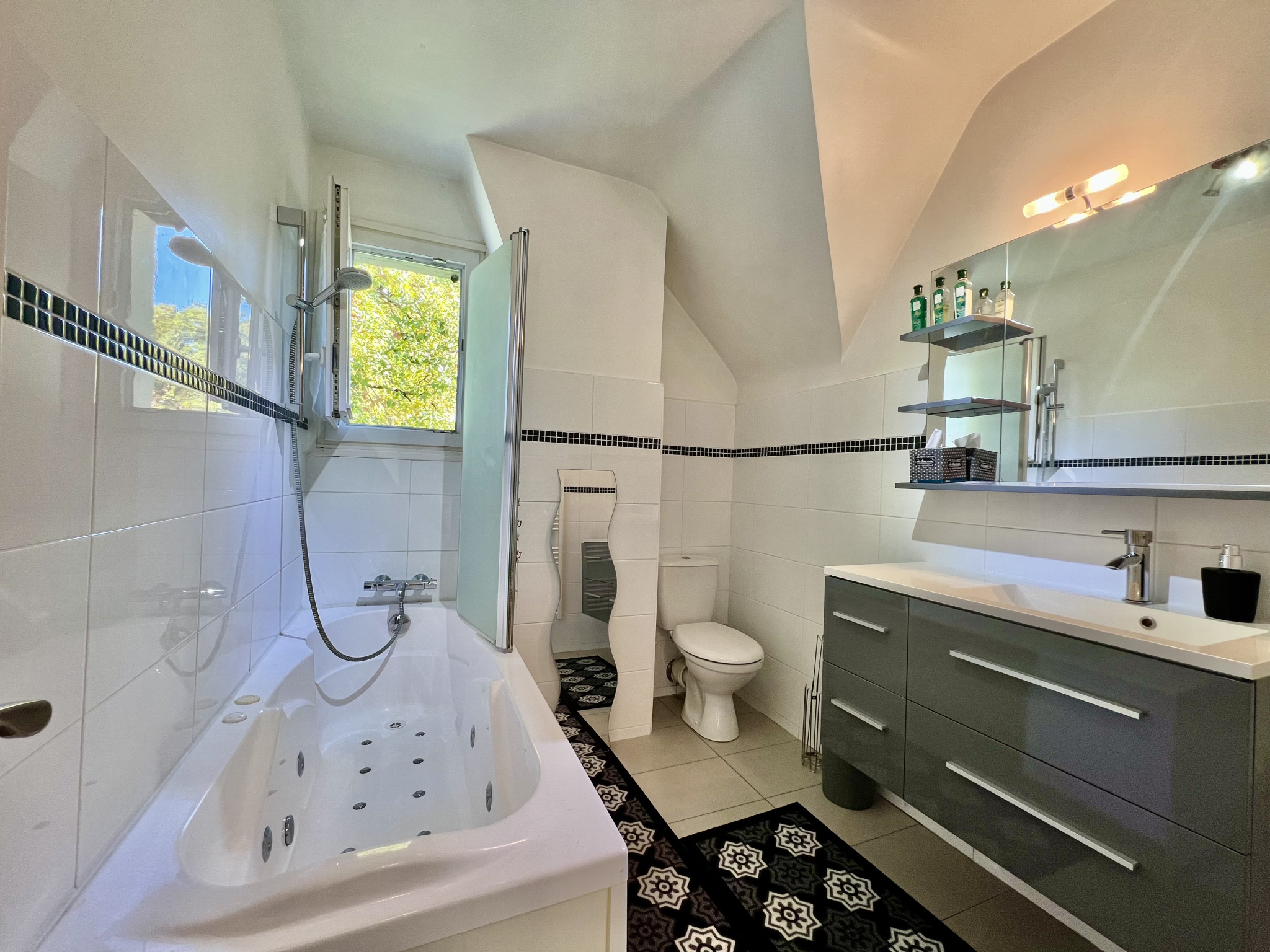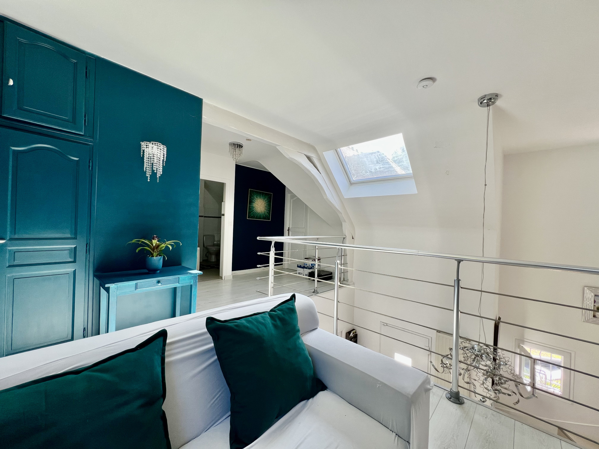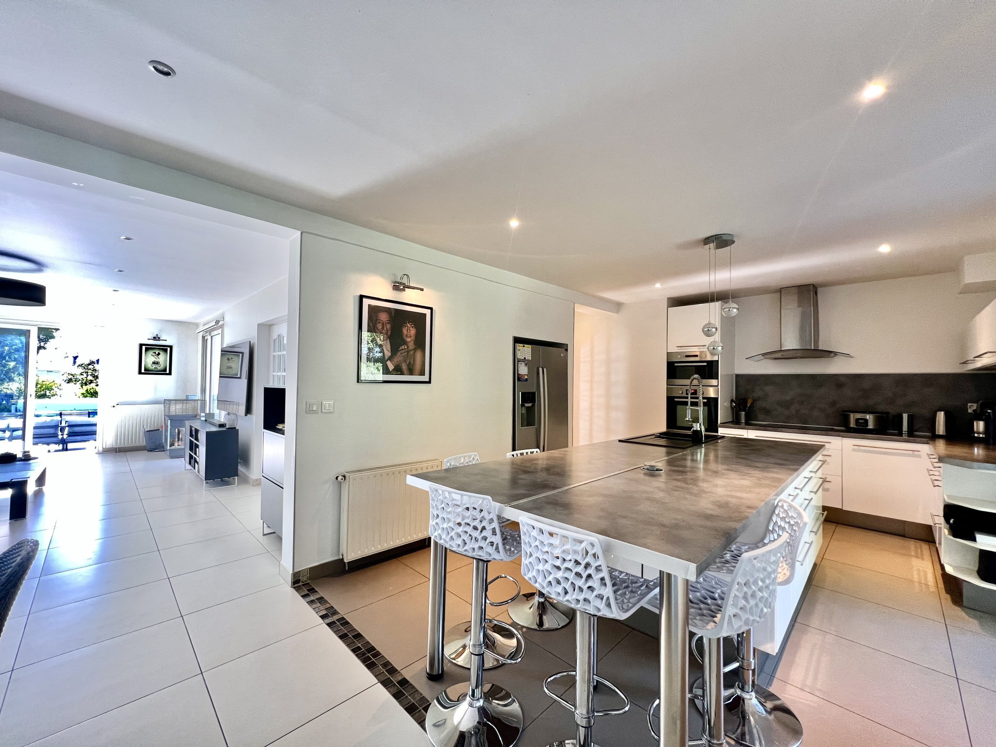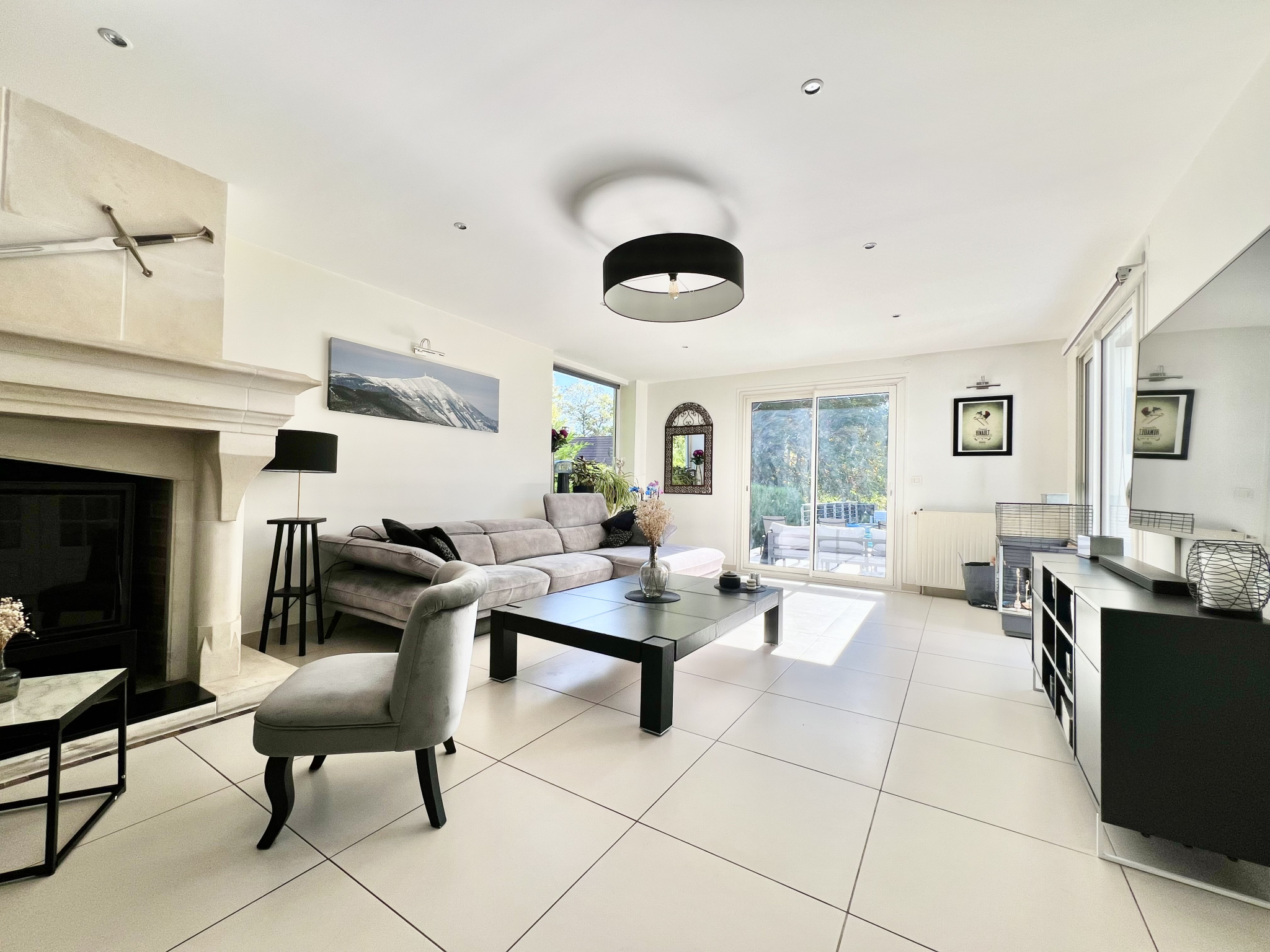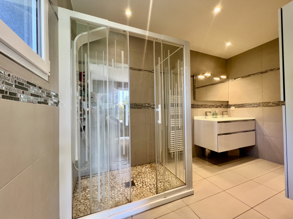 On the ground floor, a magnificent cathedral-style entrance hall leads to a 47 sq m open-plan living/dining room with a built-in fireplace and wood-burning stove. This exceptionally bright living space is bathed in natural light throughout the day and opens onto two beautiful terraces. One terrace overlooks a 12 x 4 meter heated saltwater swimming pool, equipped with a safety cover and a recently installed heat pump (2025). The other terrace offers unobstructed views of the beautiful garden, the surrounding nature, and the pond with Japanese koi – a true haven of greenery. The living area flows seamlessly into a spacious and inviting 19 sq m fully equipped kitchen, arranged around a large central island and featuring high-quality appliances, ideal for entertaining and sharing meals. A master suite of over 22 sq m with an en-suite shower room, a laundry room, and a separate WC complete this level. Upstairs, a large 31 sq m mezzanine offers the possibility of creating an office or relaxation area. Three bedrooms comprise this floor, including a master suite with an en-suite bathroom featuring a whirlpool bath, shower, and toilet, as well as a separate bathroom.