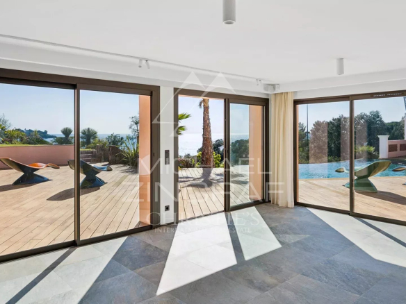 Built on a magnificent landscaped plot of over 4,000 m², the property offers direct access to the sea as well as the possibility of easily mooring with a yacht tender, a true luxury on the French Riviera.