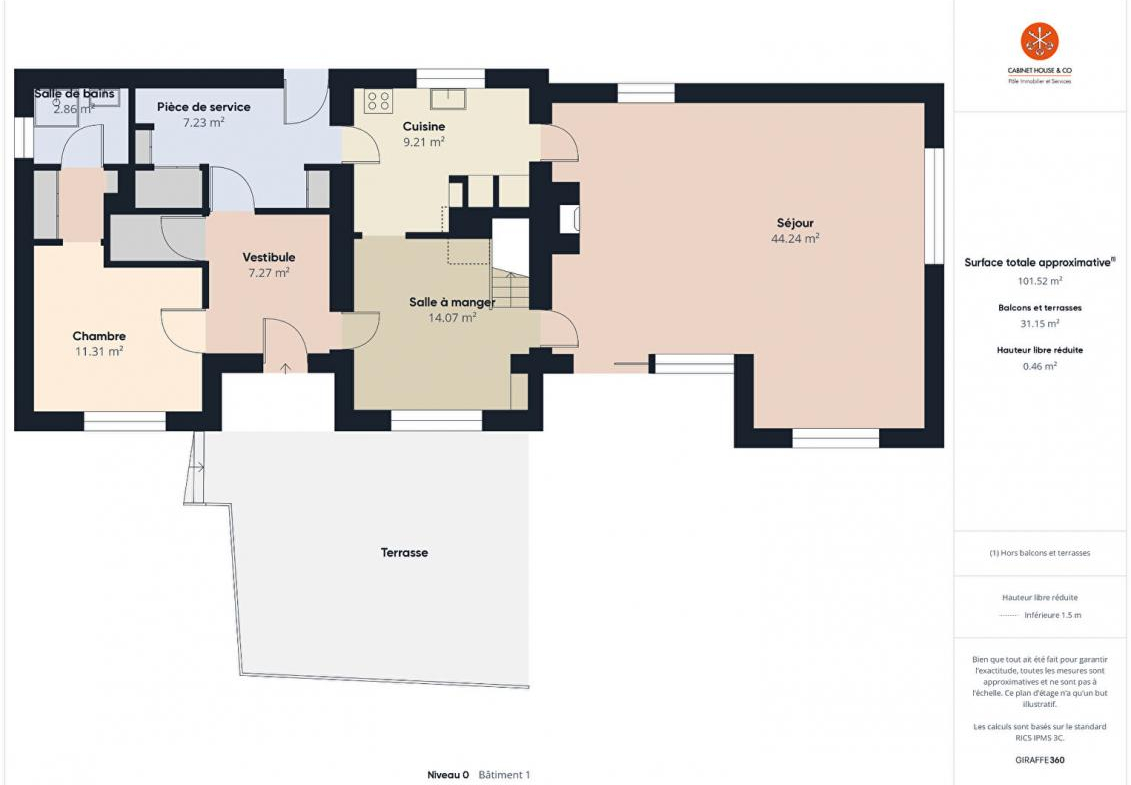 – Large, bright living room of 44m2 with a fireplace for convivial moments and opening onto a pretty terrace