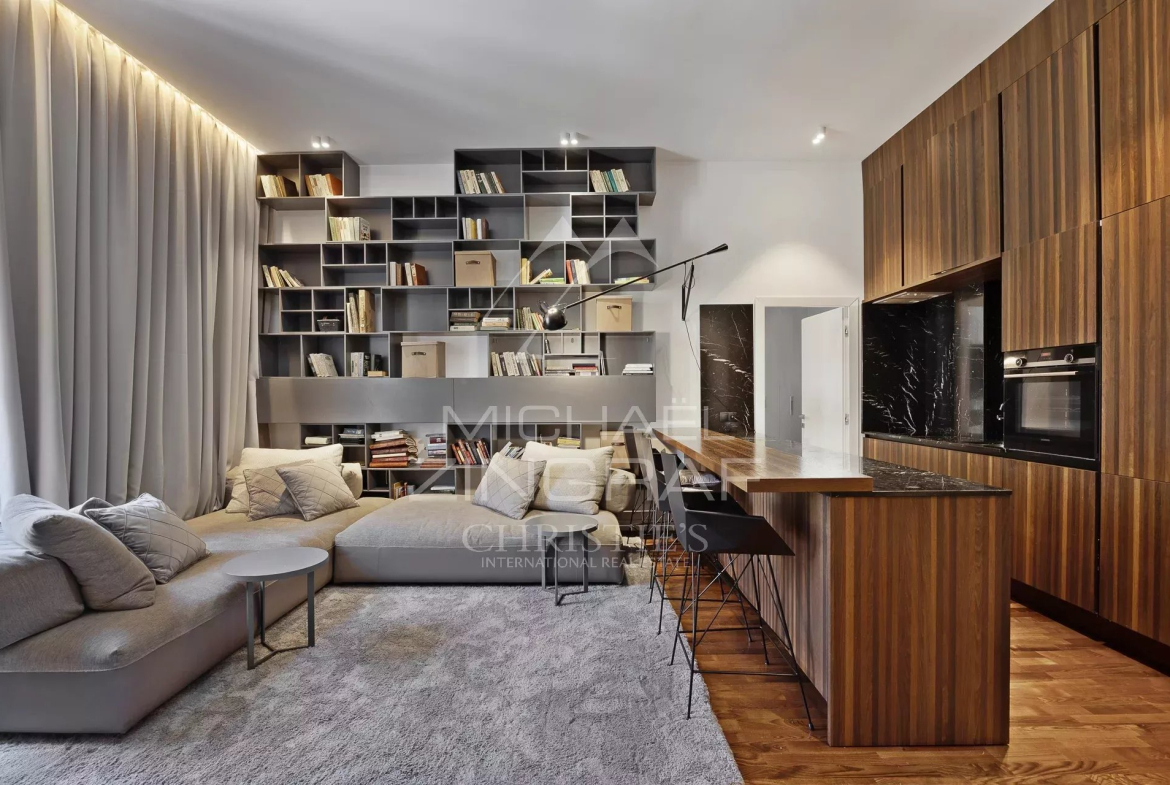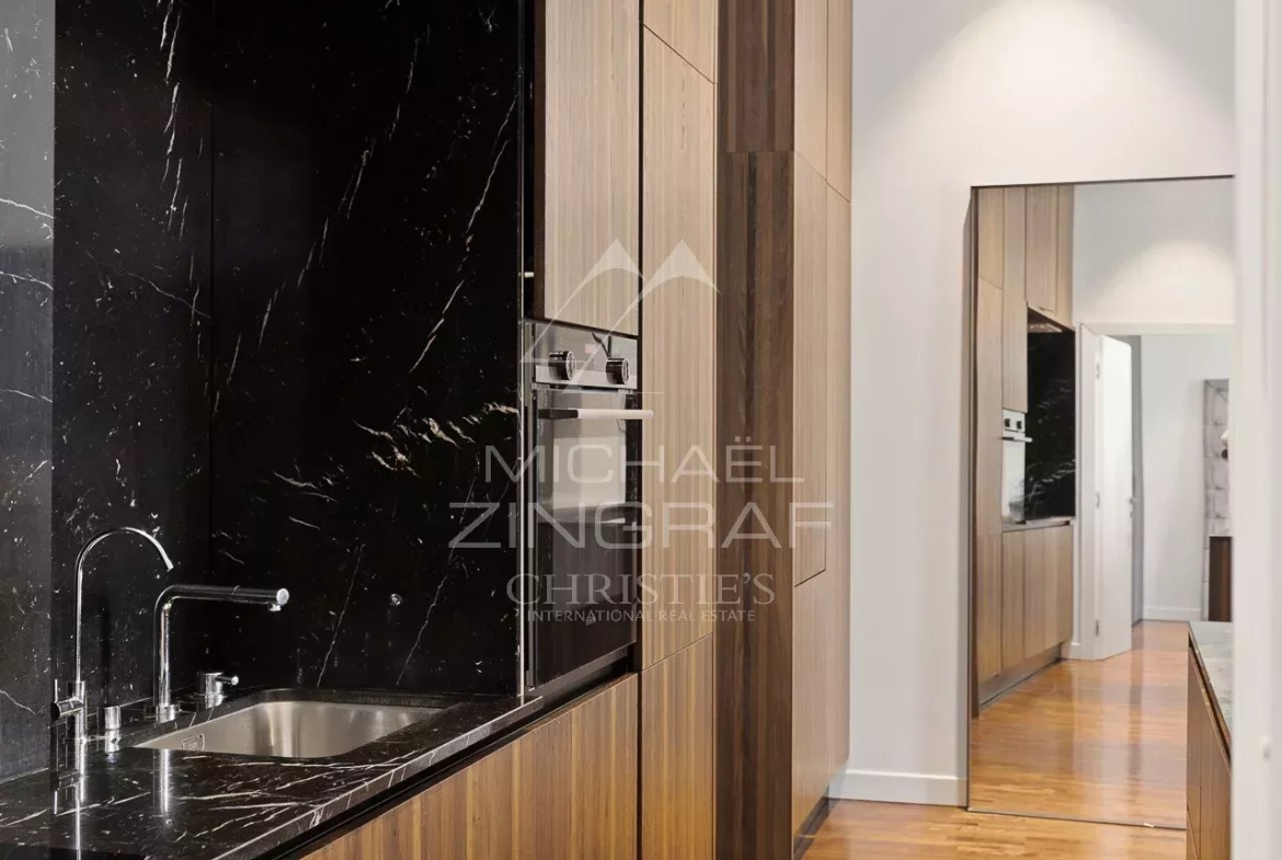 EXCLUSIVE. Located in a splendid 19th-century residence, this magnificent 2-bedroom apartment offers direct access to Mala Beach and is close to the town center. Luxuriously renovated, it features a spacious living room with a fully equipped open-plan kitchen. The master bedroom includes ample storage and a dedicated office space.