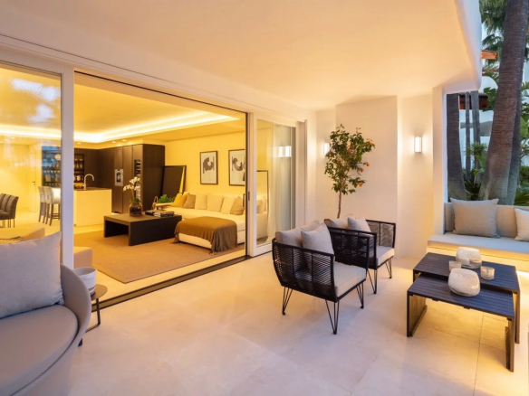 Enjoy effortless indoor and outdoor living with a spacious terrace overlooking a magical Japanese garden and just steps from Marbella's golden beaches.