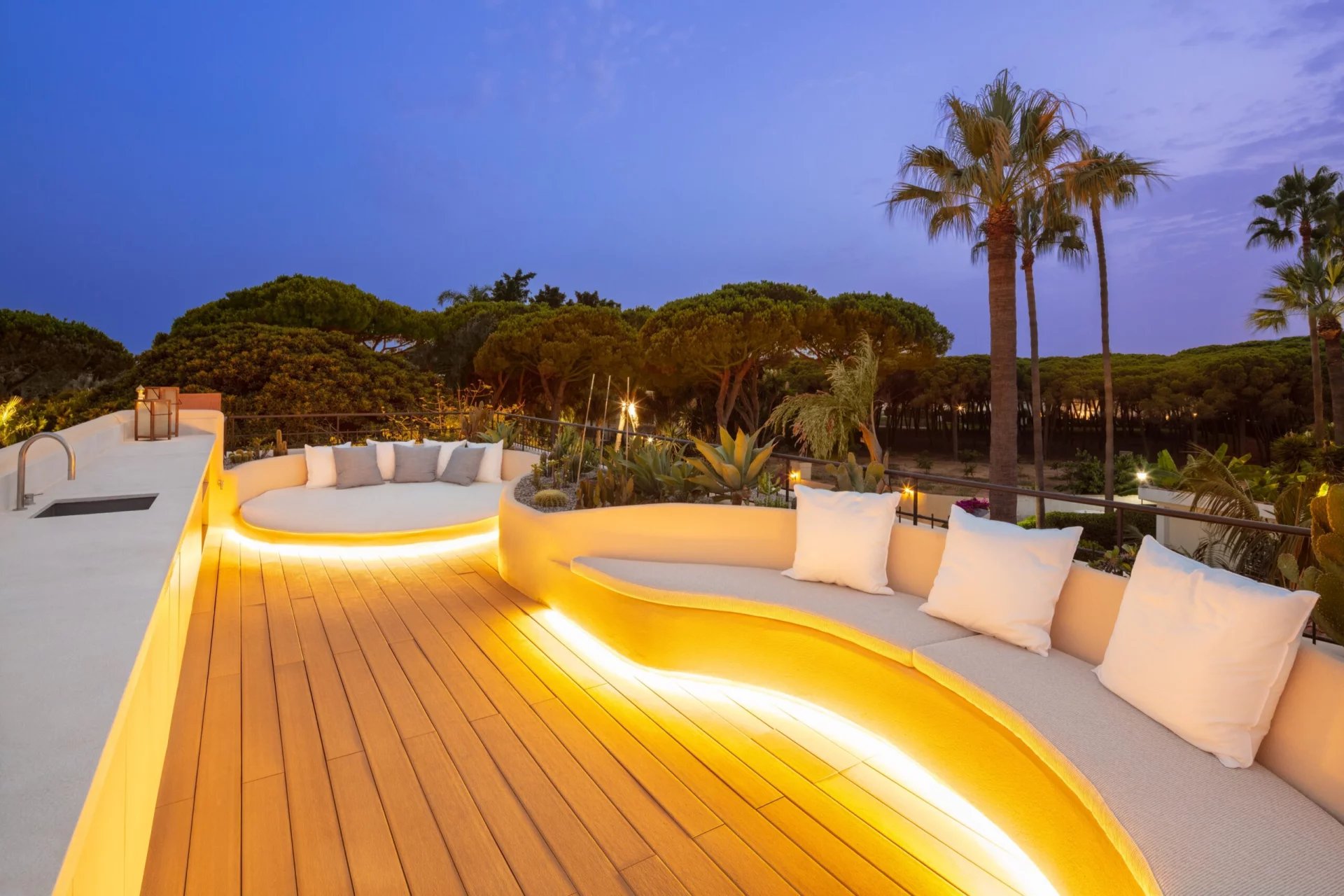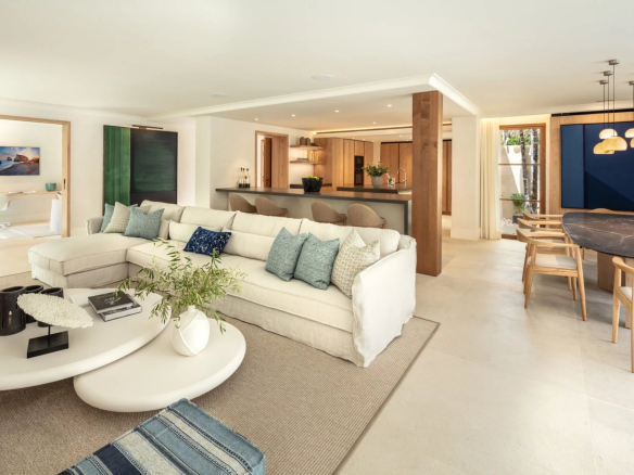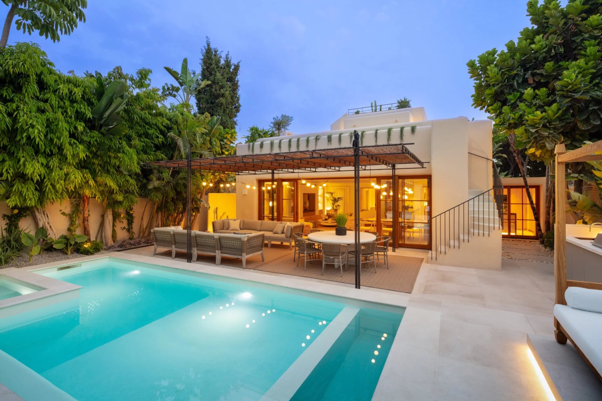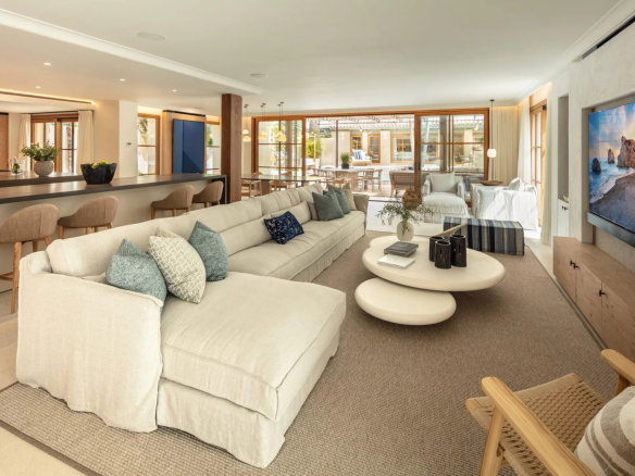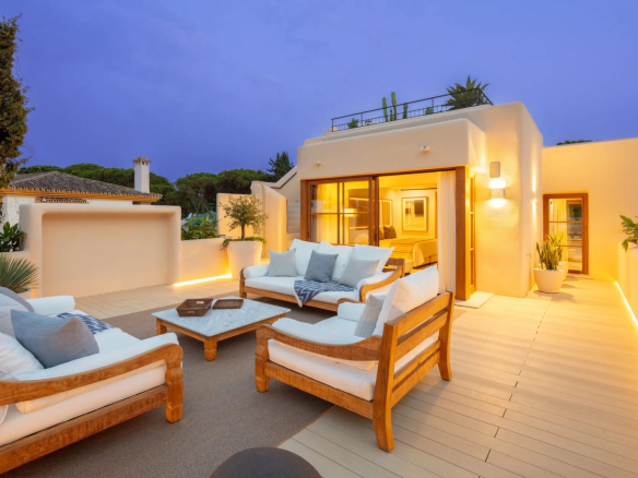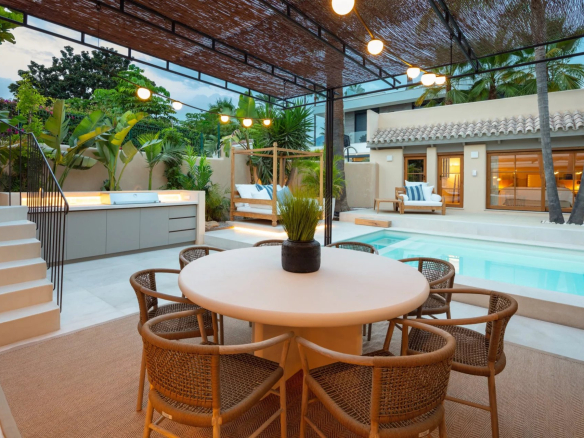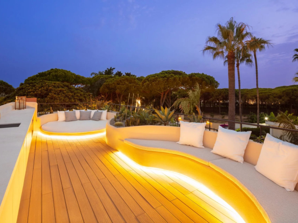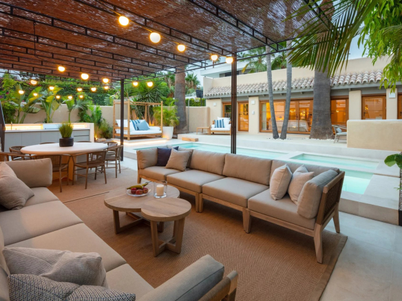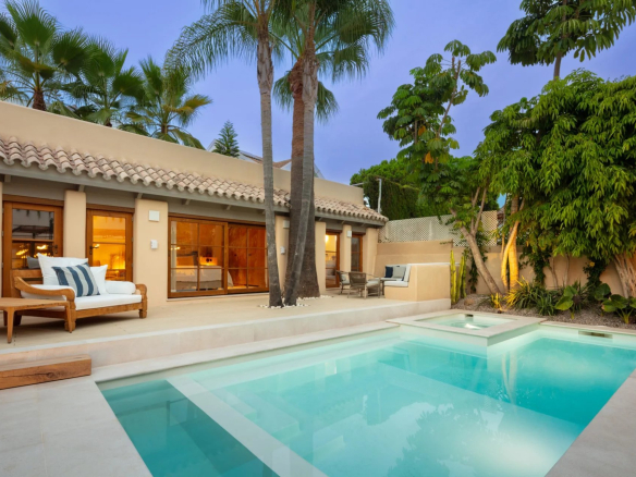 Exquisite Mediterranean villa nestled on private grounds in the prestigious Casablanca district of the Golden Mile. This majestic villa enjoys a prime location, just minutes from the Golden Mile promenade. This distinguished area boasts a variety of luxury amenities, including 5-star hotels, designer boutiques, gourmet restaurants, and lively beach clubs. The spacious property features a bright, open-plan family room, an inviting chef's kitchen, a breakfast bar, and a dining area, all with easy access to the meticulously landscaped grounds. Multiple outdoor lounges, an outdoor kitchenette/barbecue, and the dining room overlook the sparkling pool and jacuzzi, all designed to effortlessly embrace the Mediterranean lifestyle that Marbella offers. The east wing of the estate houses three en-suite bedrooms, all with direct access to the greens. The sumptuous master suite, located entirely on the first floor, boasts a huge walk-in closet and two private balconies, with the impressive La Concha mountain as a backdrop. Other fantastic amenities this estate offers include an adjacent guest house with an adjoining bedroom and integrated kitchenette, a sauna, and a rooftop terrace with built-in seating and a fireplace offering fantastic panoramic views. This grand property is a must-see.