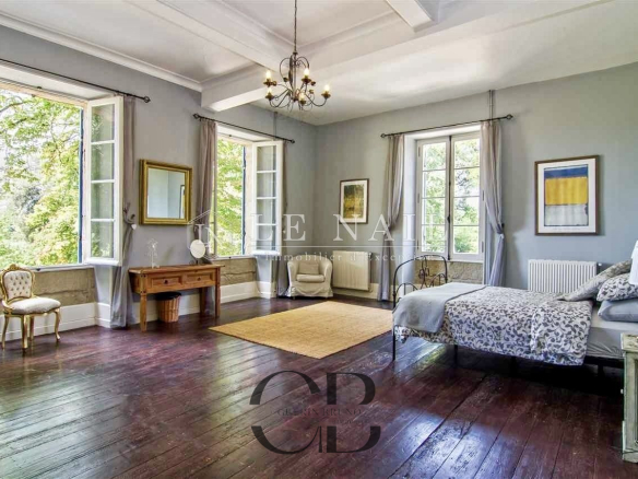 Beautiful country house in Lot-et-Garonne. Located in the hilly countryside in Lot-et-Garonne, of which you will appreciate the calm and good life of the region, this magnificent 18th century property, perched on the heights, is 9 km from a village ensuring the first services and 30 minutes from Bergerac, the resource city. The city of Bordeaux is located 125 km, Paris at only 3:15 a.m. from the city of Bergerac (TGV), and London in 2 hours with daily rotations from Bergerac. We access the castle by crossing a grid and an alley bordered by oaks. A beautiful dovecote stands in the entrance courtyard of the property. This elegant and imposing 18th century property is made up of a main body and various outbuildings that form a rectangular courtyard where life is organized around a swimming pool and several terraces. Completely built in local stones which have grayed over time, the facade and the many openings, in the Mediterranean colors, offer an interesting contrast. The building is covered with tiles of channel types, the chains, the foundations are underlined by a major work. The castle, with a living area of approximately 640m2, includes: on the ground floor: a large entrance (37m2) opens on two rooms, on the right a living room (32m2) with fireplace and adjoining library, on the left a billiard room (37m2) and adjoining wc. An release of a beautiful area allows access to the floor and the second part of the ground floor, an office (34m2) communicating with the library, a living/dining room with a completely fitted kitchen area (93m2). Adjoining the kitchen area a back kitchen with the second staircase for the floor, then a staircase to access the cellar. Upstairs: 7 bedrooms including 5 with bathrooms/showers, all benefit from a clear view of the countryside. On the second floor: an attic (100m2). In the basement: a cellar This real estate set is intended for rental during the summer, the owners who renovated an old barn in 2014 in order to create 3 dwellings and a common space. The first two dwellings are lodges comprising, on the ground floor: a large living/kitchen and upstairs: 2 bedrooms with a bathroom and WC. Outside: a large terrace with private swimming pool, the whole is at the standards of modern comfort. The caretaker's accommodation includes on the ground floor a large living/kitchen and upstairs 2 bedrooms with a bathroom and WC. Outside, a large terrace, the whole is with modern standards. The common space includes a large lingerie and a fitness space. Located in the park of the castle sheltered from eyes, a completely renovated dovecote including: on the ground floor, a living space (kitchen/living room) open on the wooden terrace and upstairs a bedroom and a bathroom. A garage, stable for horses, a large covered terrace and a barbecue area. The castle is located in the middle of a pleasant park of more than 7.21 ha. Different species of trees are established there, certain centenarians, to emphasize that a water point is present on the property.