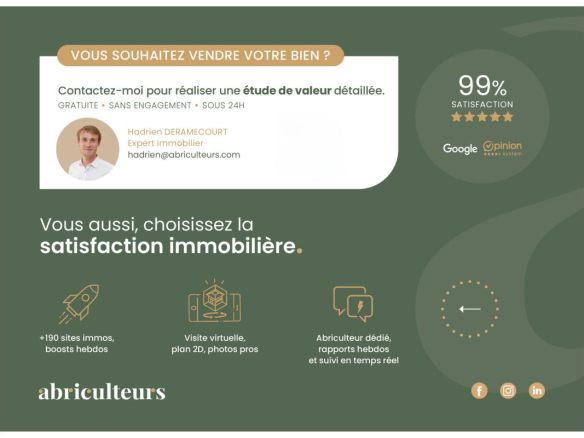 Advertisement written under the editorial responsibility of Mr. Hadrien Deramecourt, commercial agent (EI), registered with the RSAC of the City of Bordeaux under number 913 910 022, without holding funds, acting on behalf of the SARL Abriculteurs immobilier, with a capital of €5,000, registered under SIREN number 837 704 584, holder of professional card number CPI 7501 2018 000 025 842 issued by the CCI of Paris Île-de-France, whose legal representative is Mr. Adrien Piot, having its registered office at 12 rue des Halles, 75001 Paris.