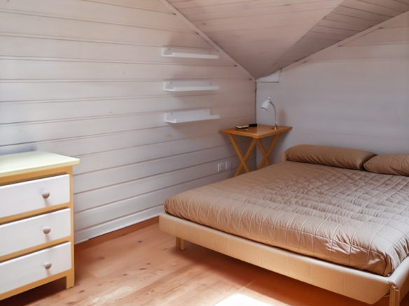 One section of this 56m² house comprises a living room, an open-plan fitted kitchen, a bathroom with double vanity, a separate WC, a terrace, and a landscaped garden. The sleeping area consists of three bedrooms, one of which is suitable for a child. A private parking space is also included.