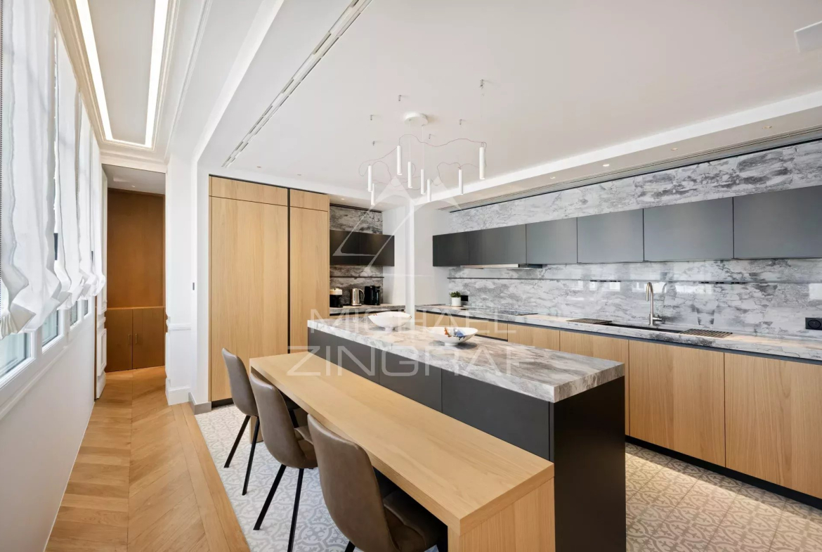 The first level consists of a double living room benefiting partly from a clear view of the Eiffel Tower, a dining room, a Family Room space, an independent kitchen, a laundry room, guest toilets and several dressings.