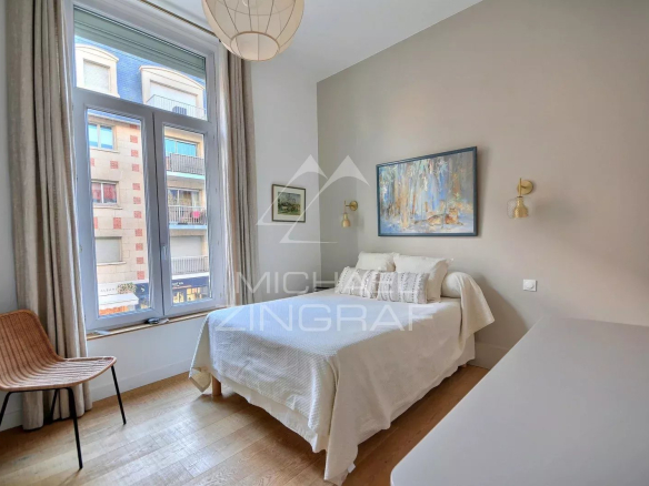 In Normandy, in the golden triangle of Deauville and in a listed building, art deco style, located on an almost pedestrian street, a fully renovated 4-room apartment offering beautiful light and remarkable ceiling height.