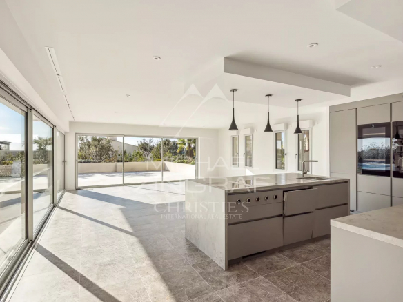 The second apartment, approximately 141 m², also includes a living/dining room with an open-plan kitchen and access to a spacious terrace with sea views. It comprises three en-suite bedrooms, a guest toilet, a cellar, and an open garage.