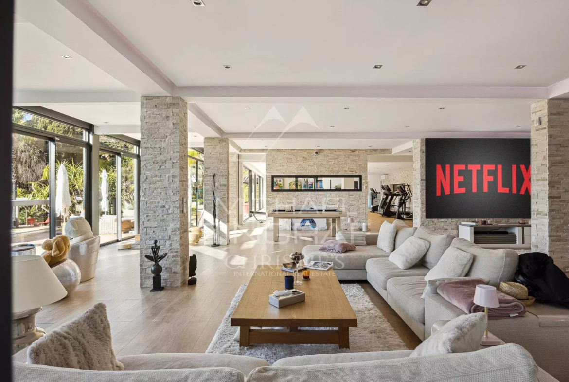 Located in one of Cannes' most prestigious residential areas, facing southwest, with no overlooking neighbors and boasting remarkable sea views, this beautiful, fully renovated modern Provençal-style property offers spacious, light-filled reception areas that extend onto a terrace, garden, and swimming pool, providing unparalleled comfort. Seven bedrooms, including two independent suites with bathrooms or showers, further enhance its appeal. The property also features a beautifully landscaped garden of approximately 2,485 m², a swimming pool, jacuzzi, and a two-car carport. Ideal as a family home.