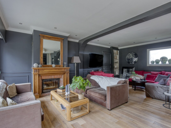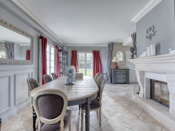 The ground floor comprises a large entrance hall, a spacious living room with a fireplace, a fitted and equipped Mobalpa kitchen with a central island, a separate dining room with a fireplace, a cloakroom, and a bedroom with an en-suite shower room.