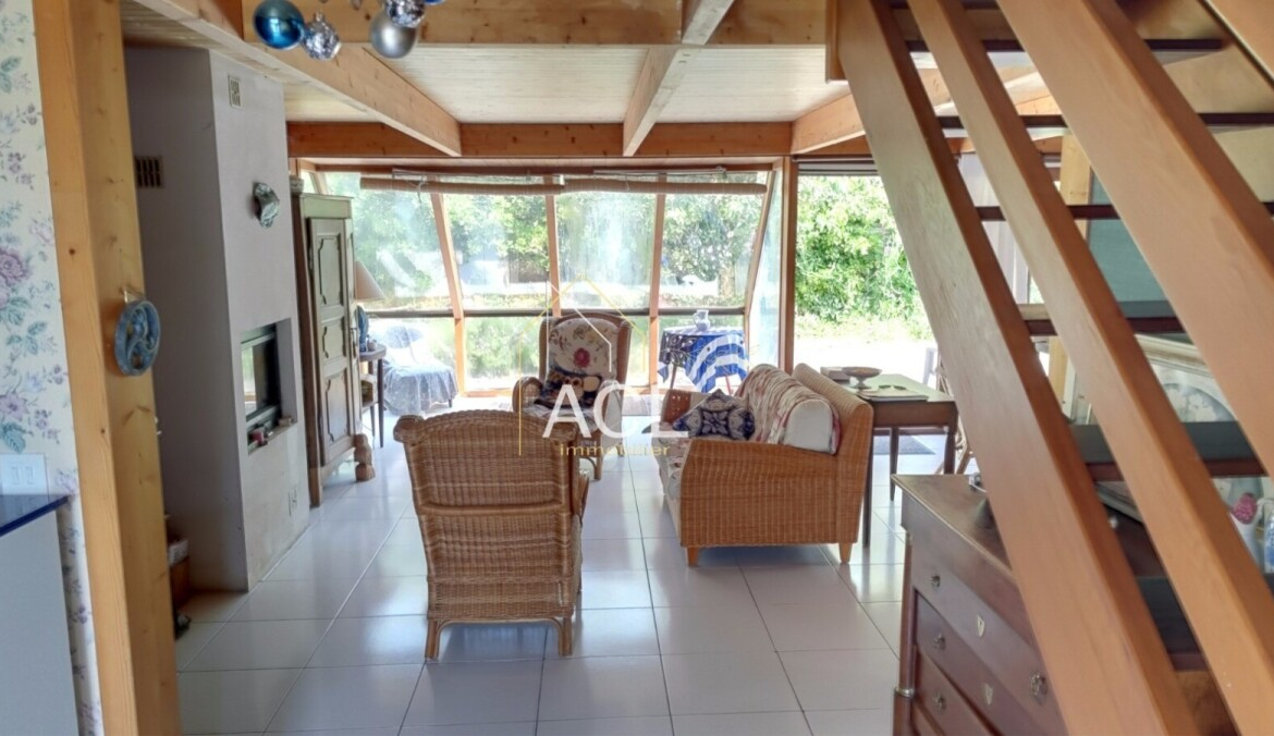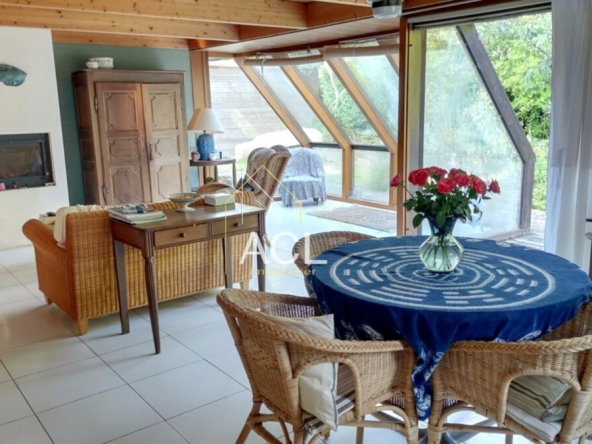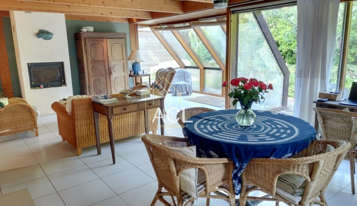 Built in 1987 and maintained by the same owners since its construction, this welcoming house offers 130 m² of living space spread over two levels. From the moment you enter, you are struck by the spaciousness. The generous and well-designed rooms showcase the use of fine, natural materials. The exposed Red Cedar frame, visible throughout the house, lends it a unique character, while the double-glazed windows ensure effective insulation.