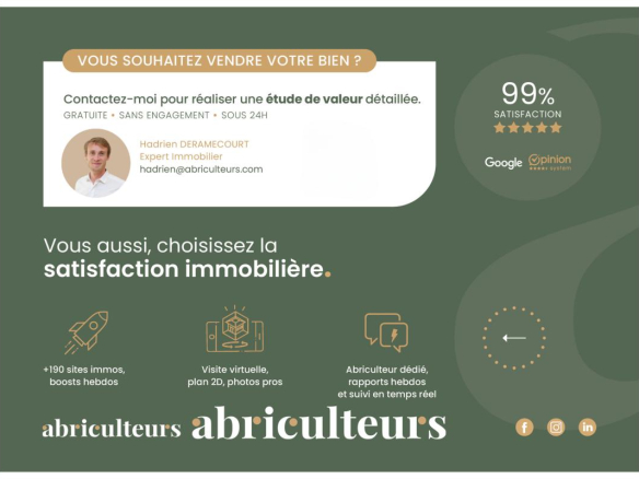 Advertisement written under the editorial responsibility of Mr. Hadrien Deramecourt, sales agent (EI), registered with the RSAC of the City of Bordeaux under number 913 910 022, without holding funds, acting on behalf of the SARL Abriculteurs immobilier, with a capital of €5,000, registered under SIREN number 837 704 584, holder of professional card number CPI 7501 2018 000 025 842 issued by the CCI of Paris Île-de-France, whose legal representative is Mr. Adrien Piot, having its registered office at 12 rue des Halles, 75001 Paris.