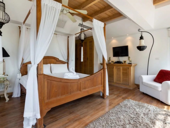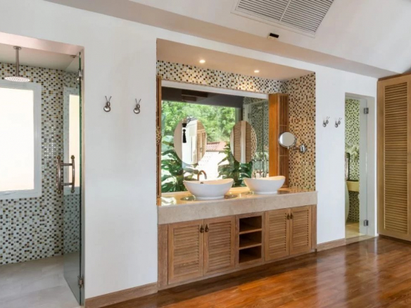 The villa has eight large bedrooms, all with king-size beds and en-suite bathrooms. The master bedroom, with a large bathtub and terrace, is located on the upper floor, adjacent to a second upper floor. Two large guest bedrooms are situated on either side of the main ground floor, accessible via covered walkways to provide shelter from the sun and rain. Two further bedrooms with en-suite sitting rooms are also located near the central part of the villa. Two additional guest bedrooms with private bathrooms are located at either end of the villa on the garden level.