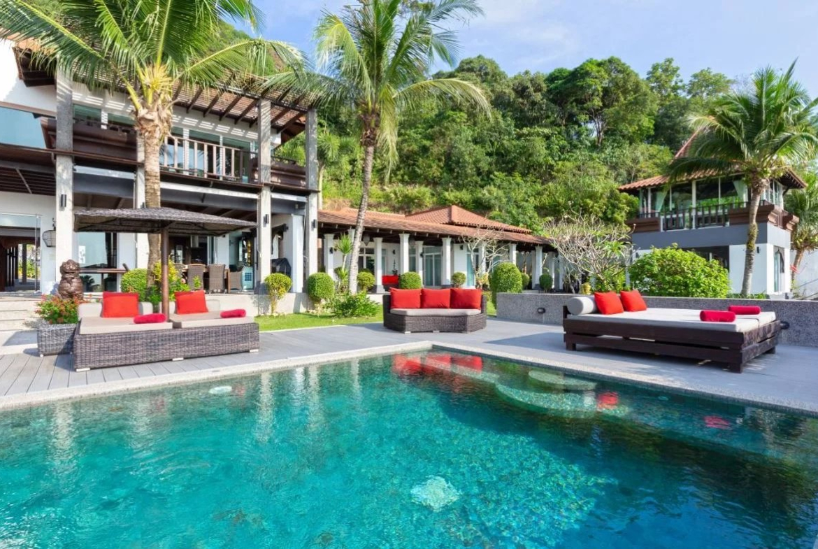 Impressive Bali Thai style, 8 bedroom mountainside sea view villa, north of Patong, with direct west coast views across the bay to the horizon.