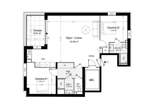 The interior impresses with its bright, spacious rooms and contemporary features. The living room, opening onto the outside through large bay windows, includes an open-plan kitchen that can be fitted to your specifications. The sleeping area comprises two comfortable bedrooms and two modern shower rooms, designed for optimal comfort. A private parking space completes this property.