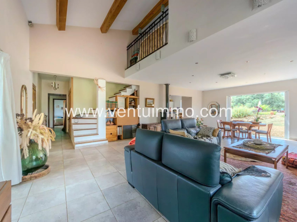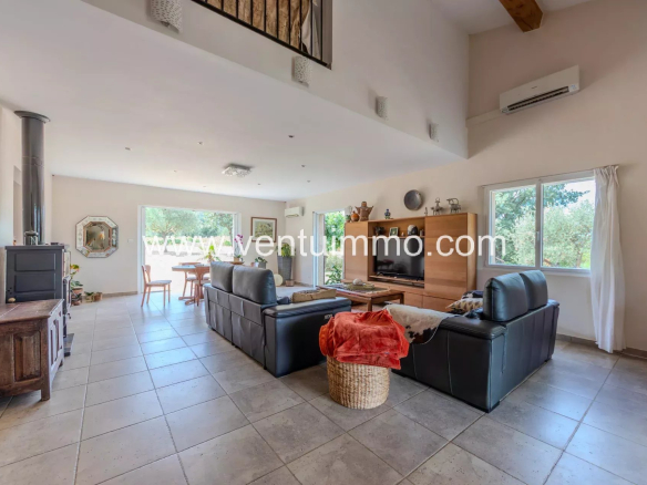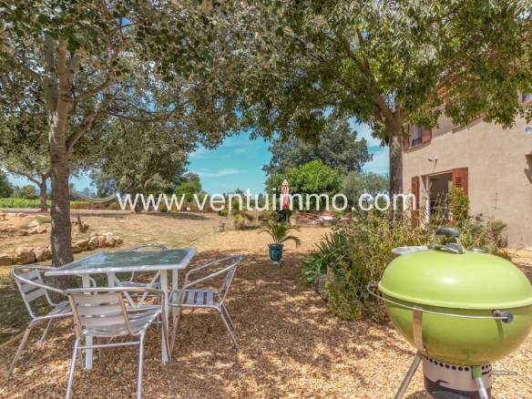 The house has a very large parking area, an above-ground swimming pool, a garden surrounding the house planted with oak and olive trees, and a relaxation area with garden armchairs and sofas.