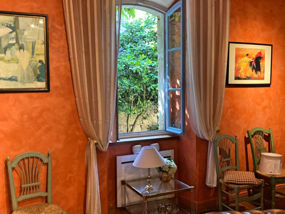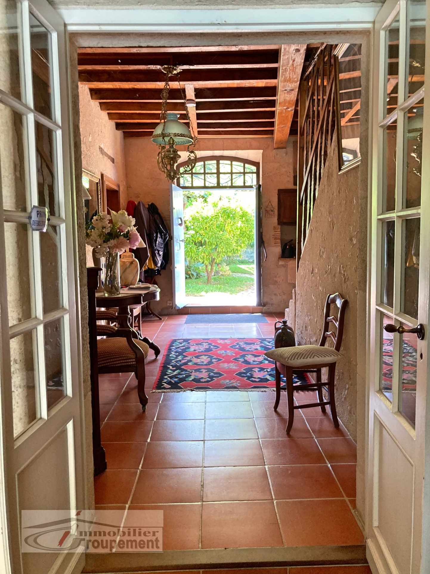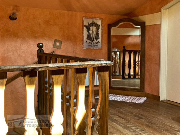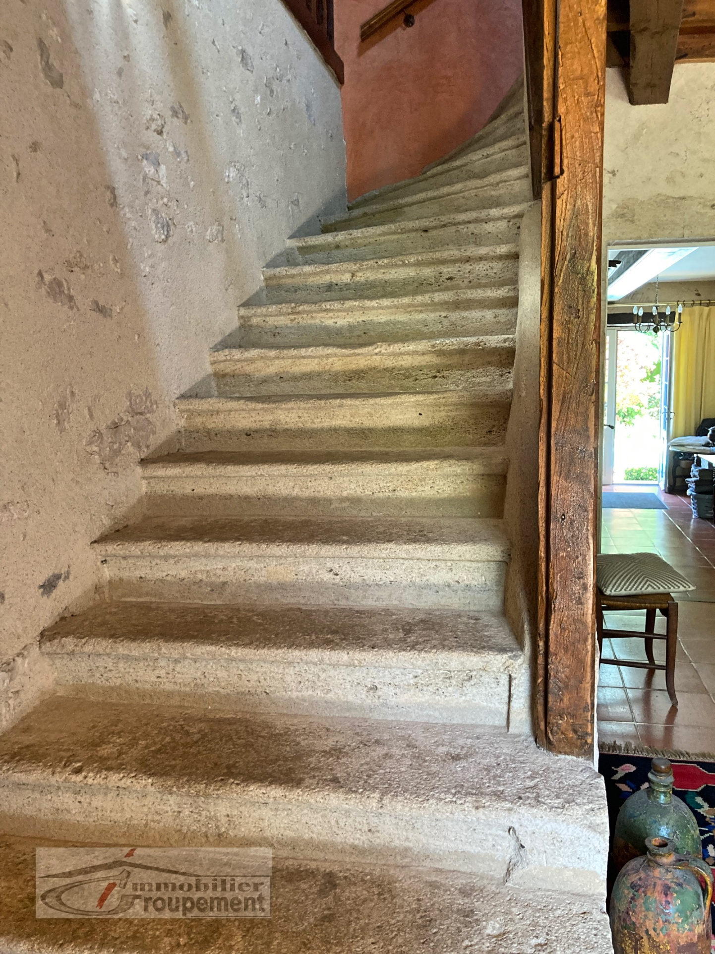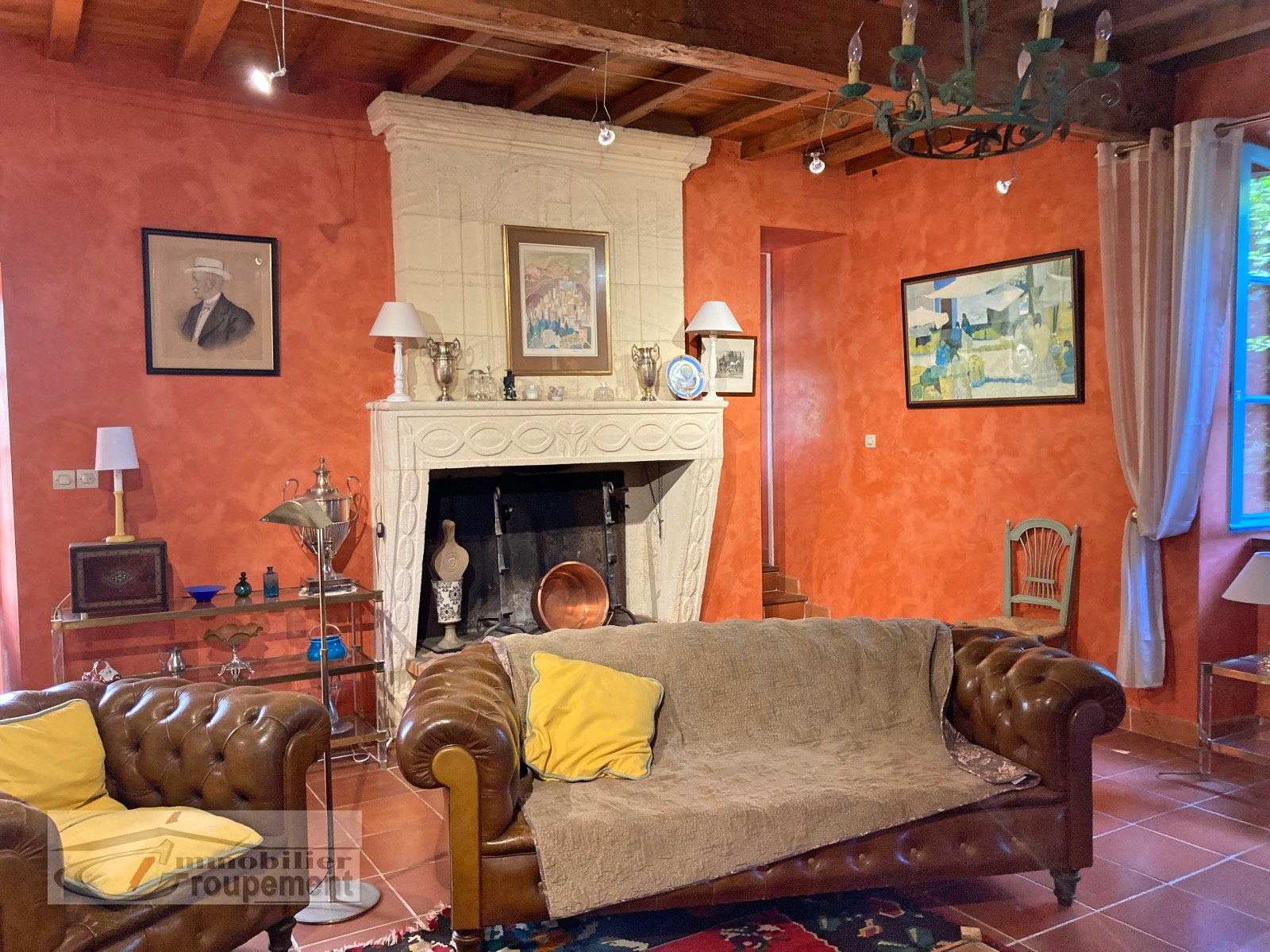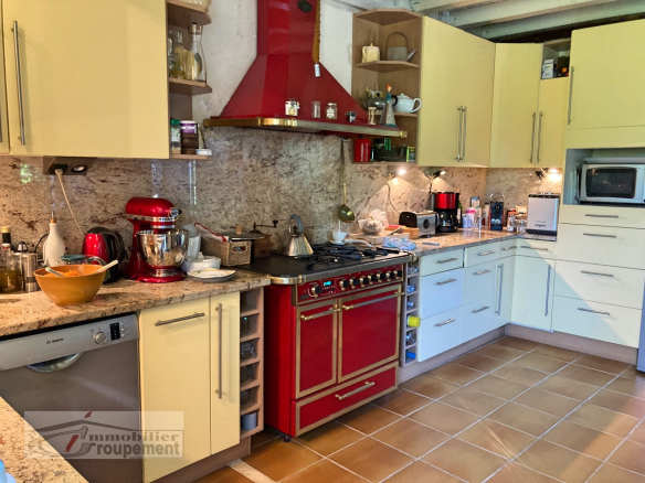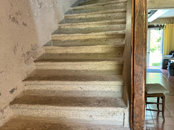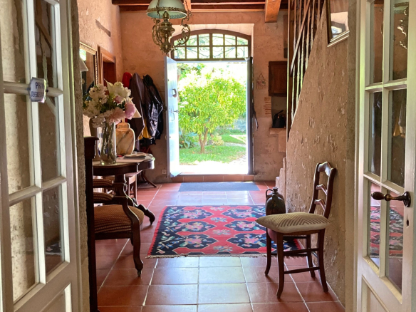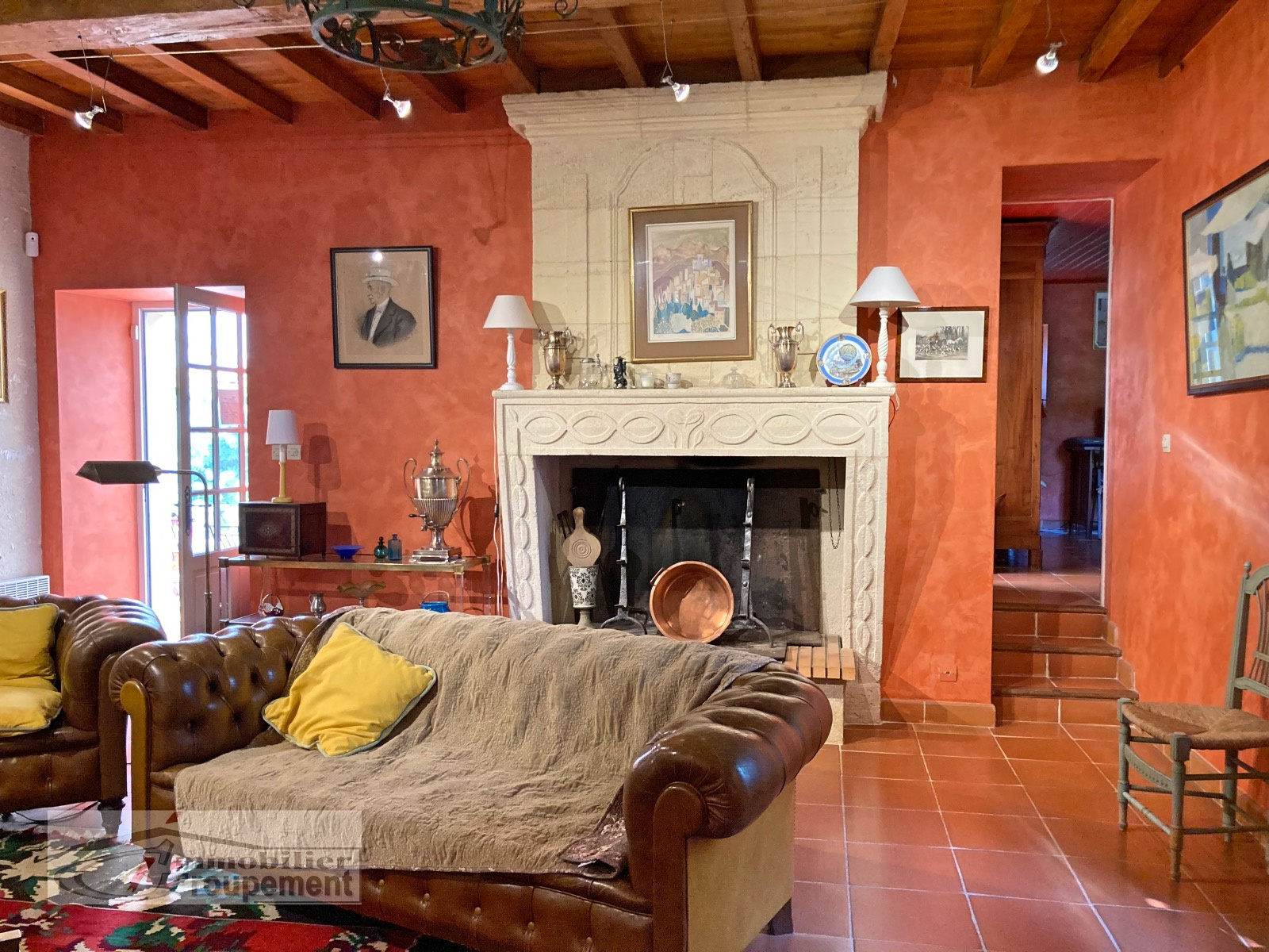 The main entrance is a large, open-plan hallway leading to its beautiful original stone staircase. It provides access to, on one side, a spacious living room with an open fireplace, and on the other, a dining room with a fireplace and a renovated, fully equipped kitchen.