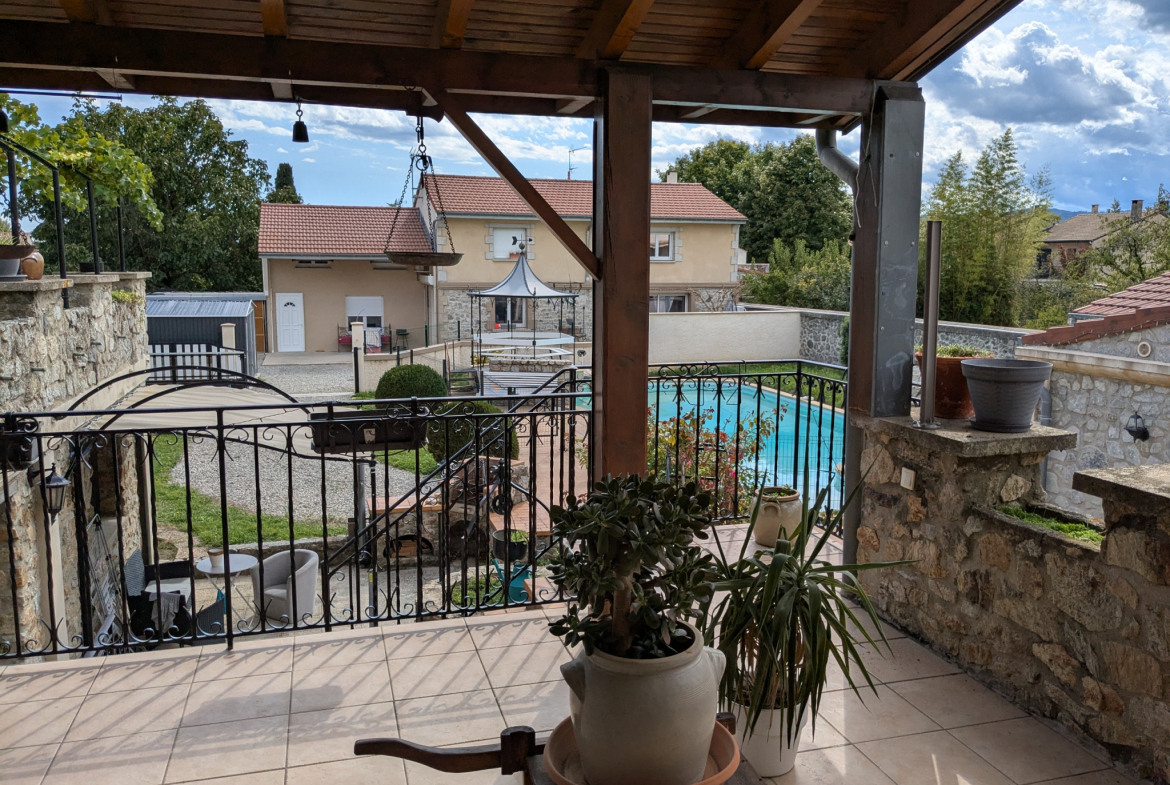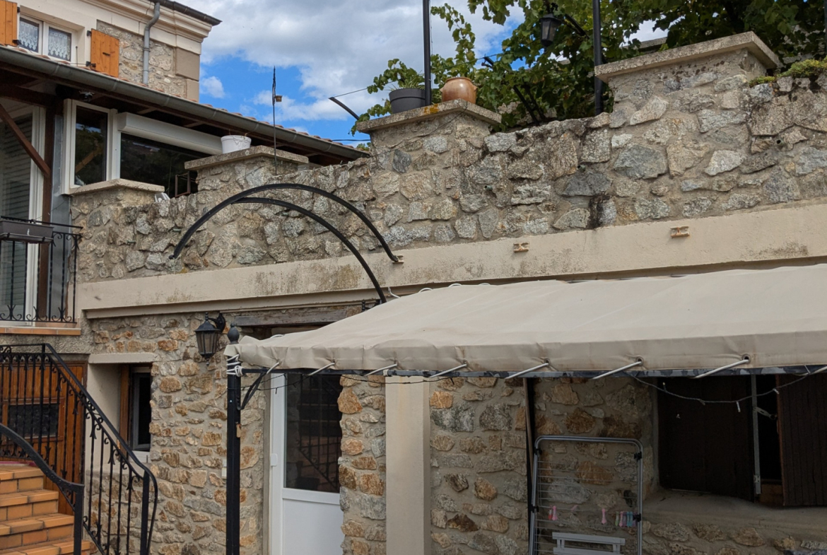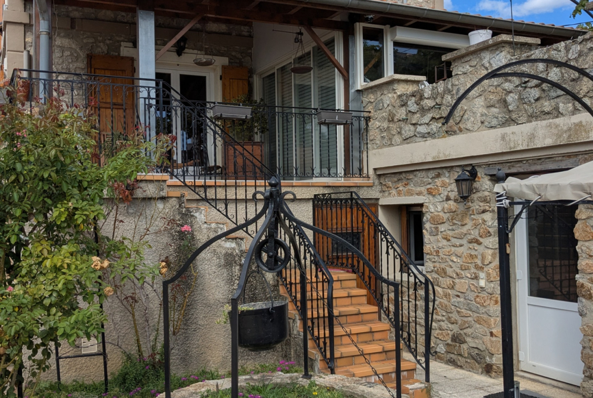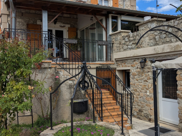 The town center and shops are a few minutes' walk away. It consists of a large stone house of 180 m2 with quality fittings with 4 bedrooms, large living room and 3 beautiful terraces, 2 of which are covered and overlooking the Ardéche.