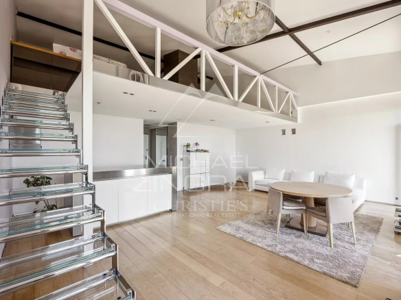 It comprises an entrance hall, a spacious living room with a fully furnished and equipped open-plan kitchen opening onto three balconies with breathtaking sea and garden views, a 35.33 m² mezzanine, two shower/bathrooms, and a WC. A truly unique property on the market.