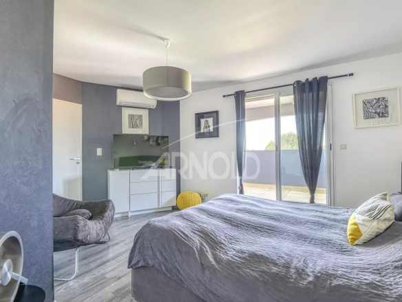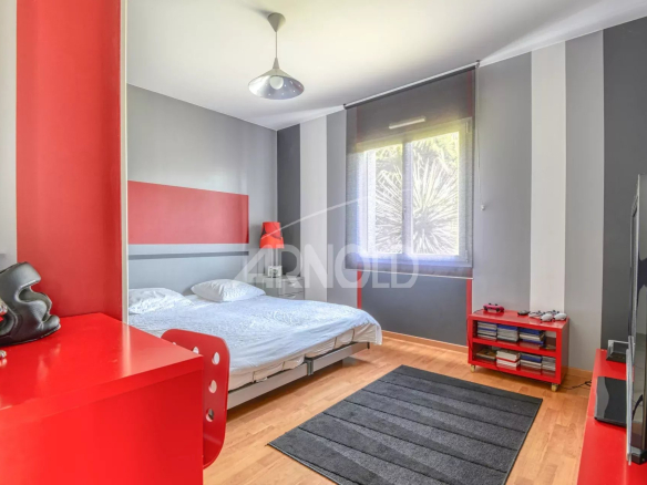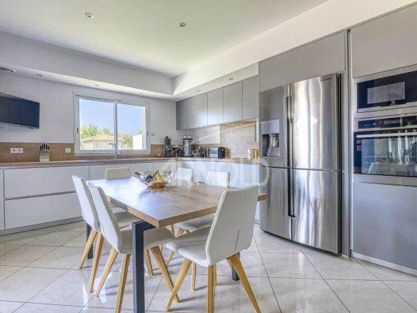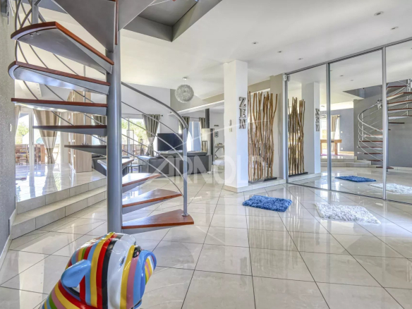 On the ground floor, you'll find a spacious entrance hall opening onto a bright living and dining room with stunning views of the garden and swimming pool. A fully fitted and equipped kitchen is also included. The living space is ideal for entertaining family and friends, with direct access to the furnished terrace for al fresco dining. A bar and billiards area is also available for relaxation and entertainment.