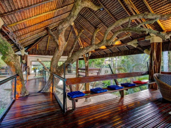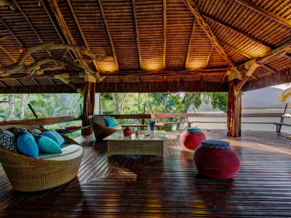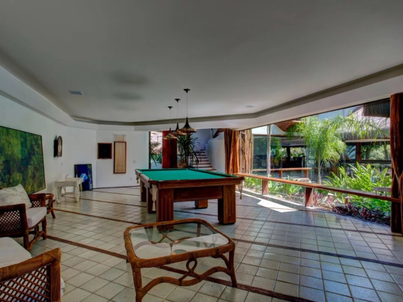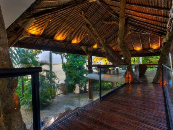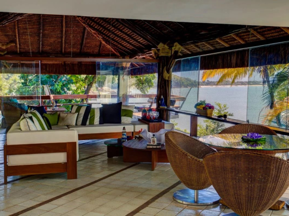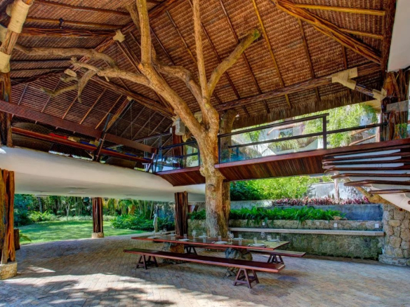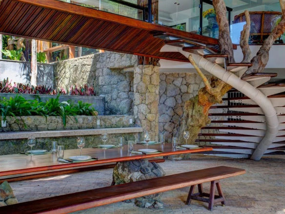Built in a natural style, the property is constructed of wood and is filled with natural light. It boasts a private beach with a boat dock and a swimming pool with three sections.