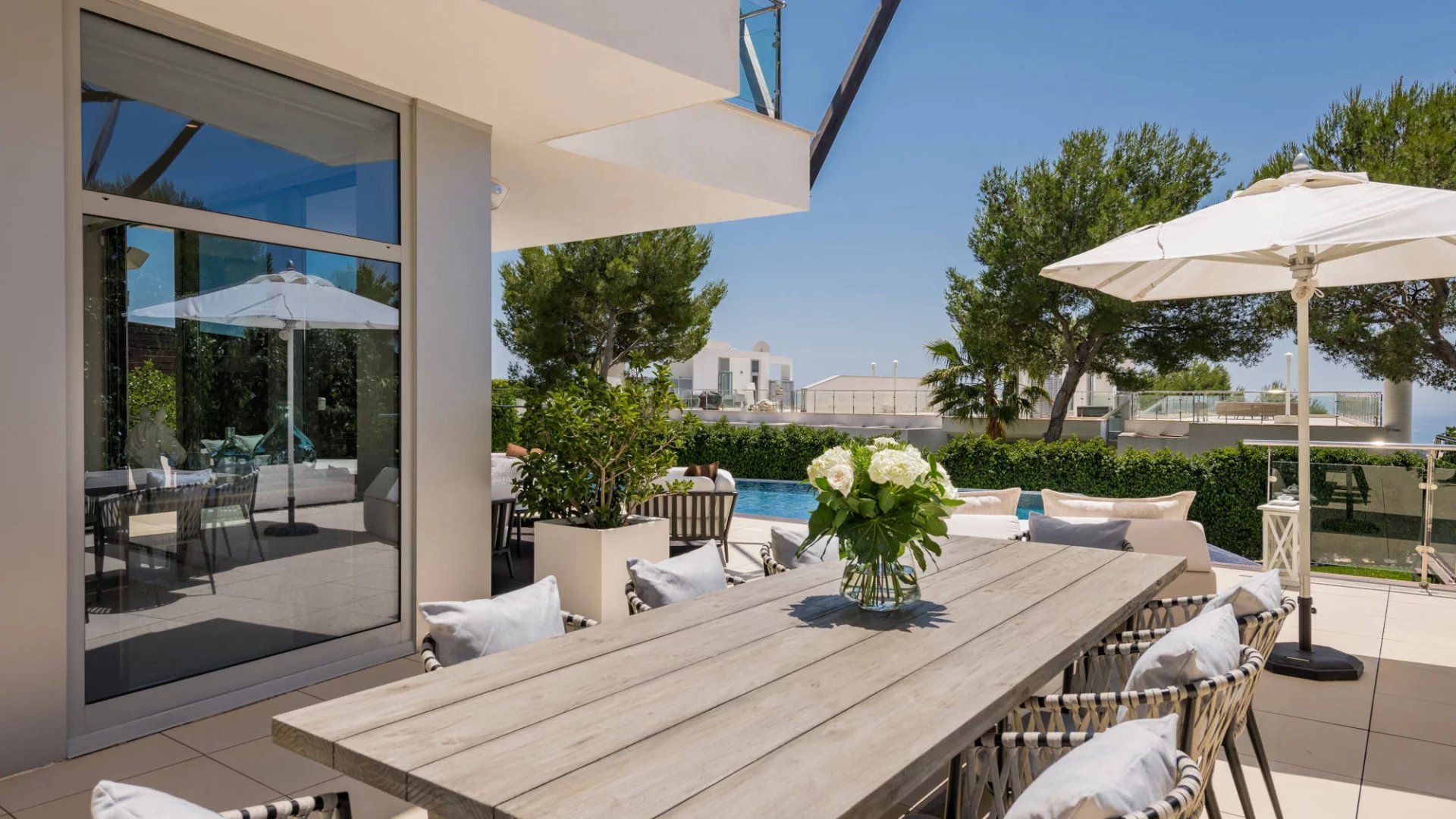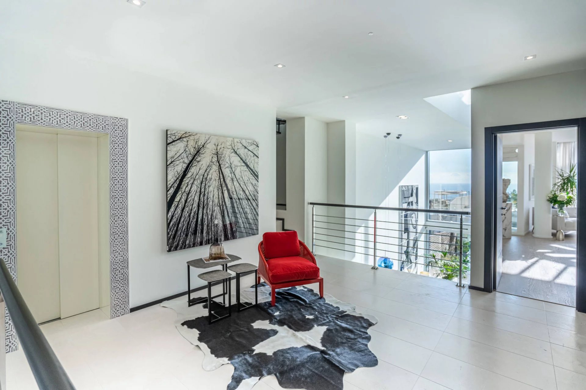 This fantastic house has 679 m2 of living space spread over three floors: basement, ground floor, and first floor, all connected by an elevator. It also boasts a large rooftop terrace of 166 m2 with a solarium, a jacuzzi, a barbecue, al fresco dining areas, and relaxation spaces. The house comprises an entrance hall, spacious and elegant open-plan living and dining areas, a fully equipped black and white kitchen with an island/breakfast nook and access to the terrace for al fresco dining, three comfortable bedrooms, three superbly appointed bathrooms, and more.