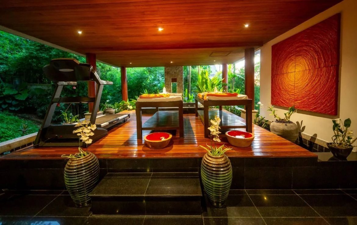 An outdoor bathtub with jacuzzi and surrounded by a curtain of green plants. Comfortable romantic terrace for two. This suite allows you to see the swimming pool and the Sala. Very beautiful room decorated in warm Makah wood, with sofa, desk, beautiful paintings and beautiful art. Minibar, coffee maker and safe, TV/DVD/CD.