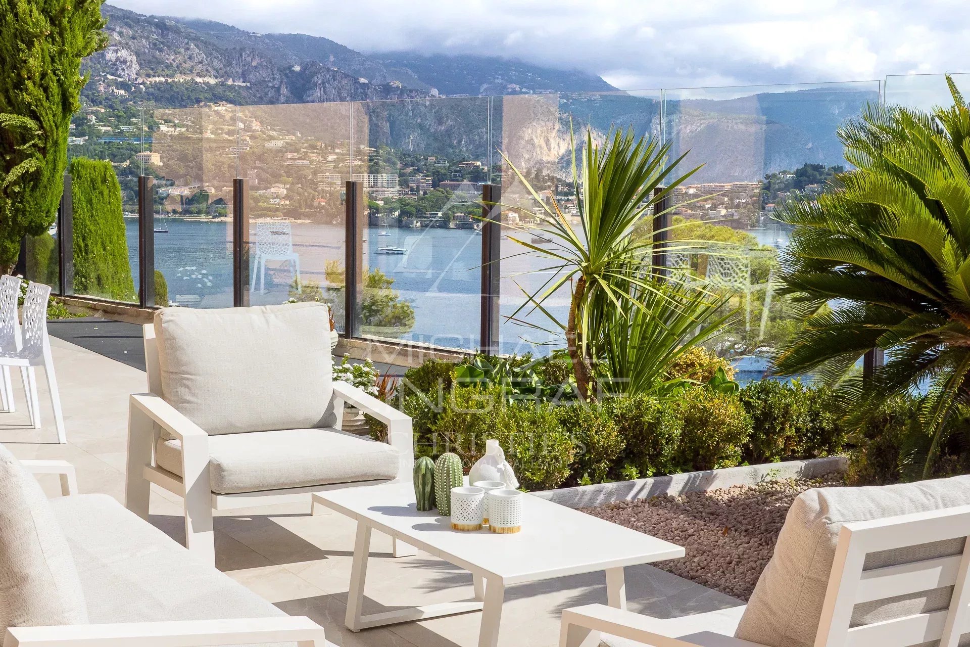 Michaël Zingraf Real Estate Nice presents: Splendid garden level apartment, located in an idyllic setting in Nice, with a breathtaking view of the harbor of Villefranche-sur-Mer.