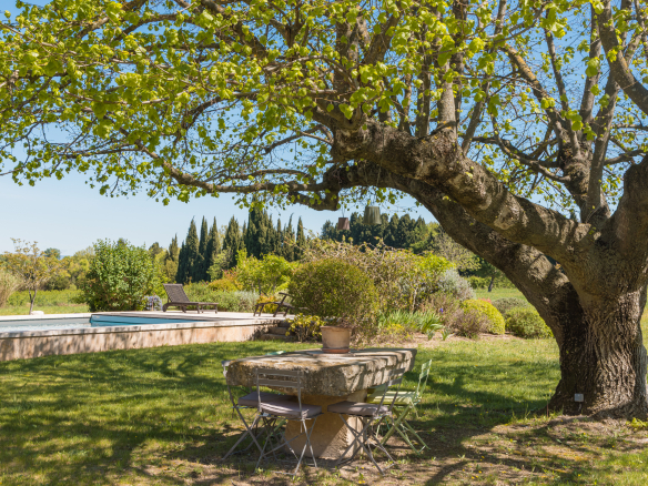 Offering an unobstructed view of the majestic Alpilles mountain range, the property embodies a Provençal way of life enhanced by a renovation blending authenticity and contemporary refinement.