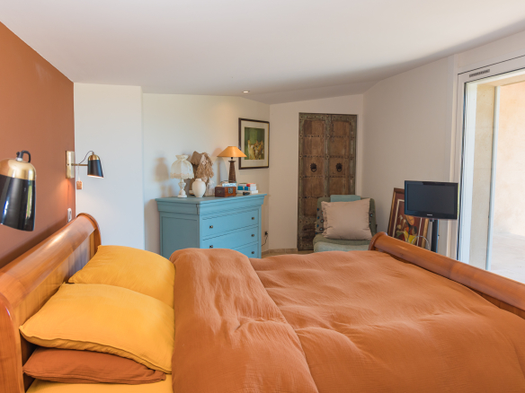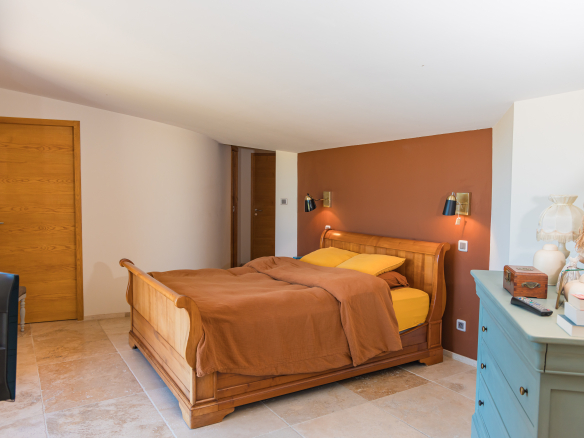 A second bedroom with an en-suite bathroom, separate WC, dressing room, and private terrace offers direct access to the pool. Upstairs, two spacious suites, each with its own shower room, and an additional bedroom are arranged around a cozy living room. A separate WC is also located on this floor.