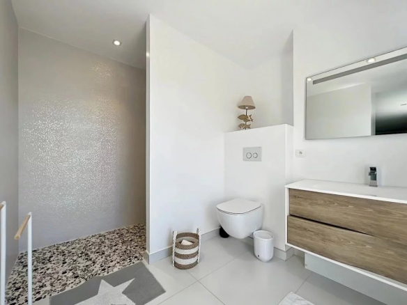 The villa, with a surface area of 244 m², has 3 large bedrooms, each with its own private bathroom, perfect for combining comfort and privacy. A separate 18 m² bungalow offers additional space for guests or personal use.