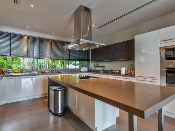 The villa features a modern kitchen with high-end appliances and cookware. Each bedroom has an en suite bathroom.