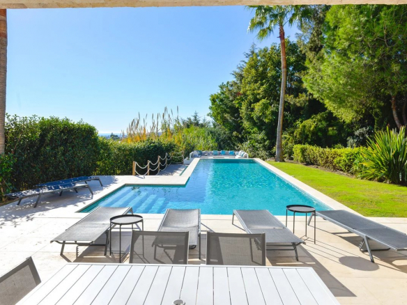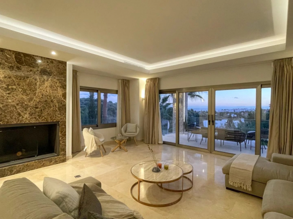 This villa has an open plan and the ground floor flows into the terrace and garden with beautiful views of the sea and also the vast infinity pool, leading to a relaxation area with a fireplace.