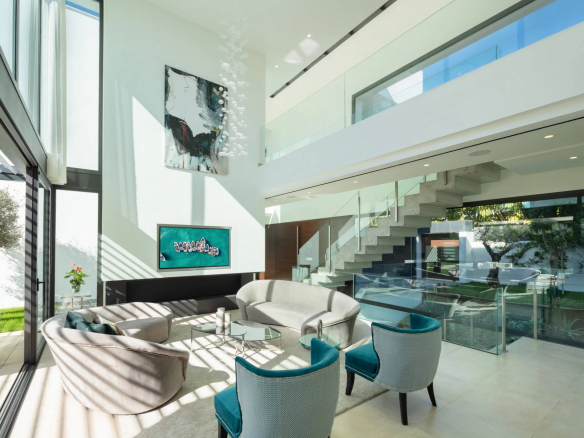 The entry level boasts a large open concept living room with double height ceilings. The welcoming exteriors include a well-kept garden which surrounds the 54m² heated saltwater swimming pool, comfortable lounges, an outdoor dining area complemented by its own outdoor kitchen and a barbecue area for al fresco dining. On the first floor you will find 3 en-suite bedrooms and a hanging gallery overlooking the impressive living room.