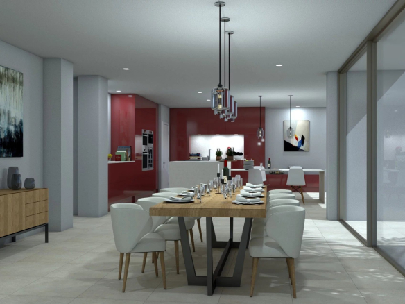 It boasts numerous terraces with outdoor dining and relaxation areas, a swimming pool, a barbecue, and a gym.