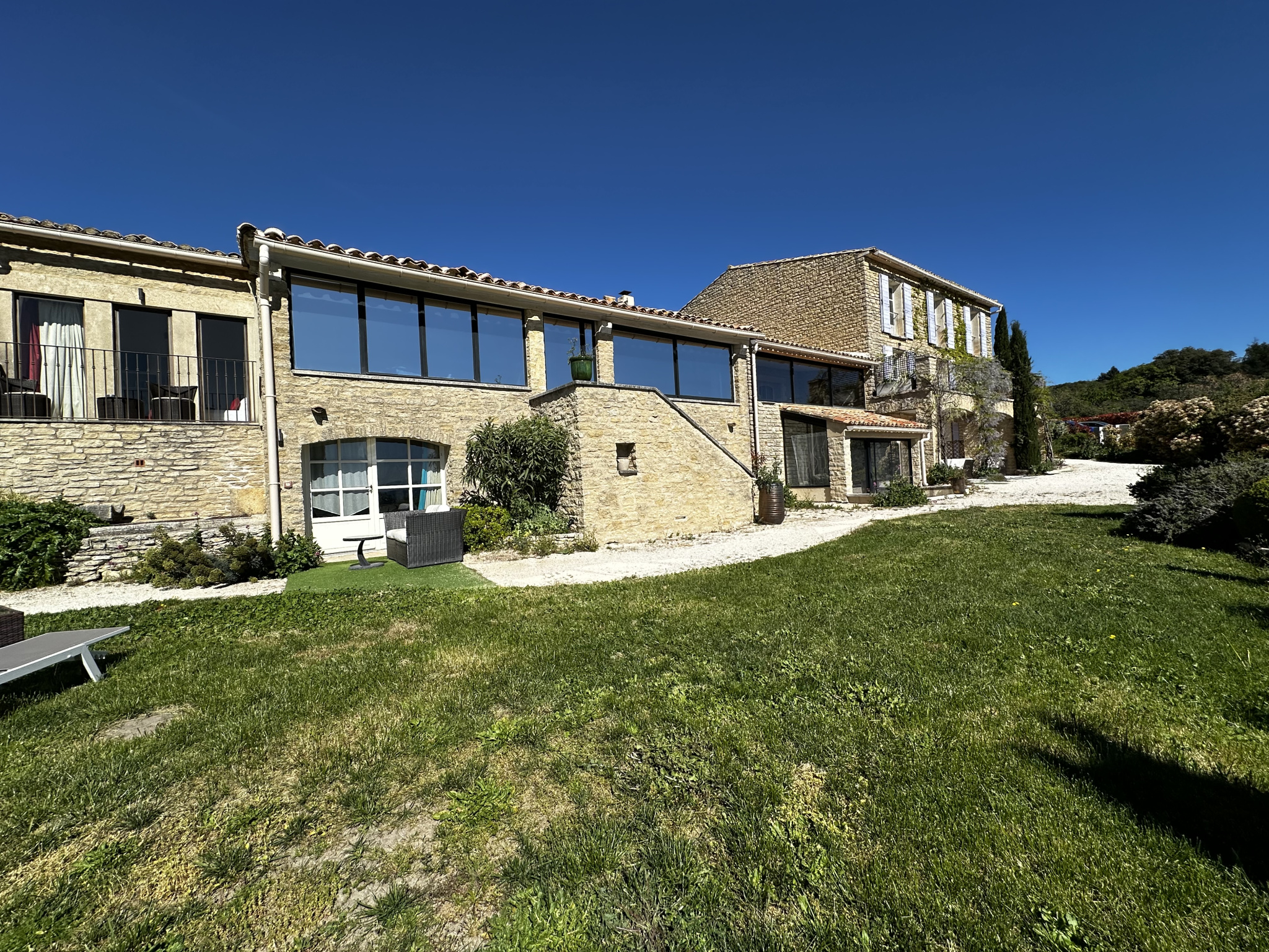 Nestled in a pine forest with Mediterranean species, this beautiful stone-built bungalow stands proudly overlooking the valley. Perched on the rock facing the Luberon, it offers a breathtaking spectacle day after day with its incredible views stretching all the way to the Alps. The decor and amenities are refined, comfortable, and of high quality.