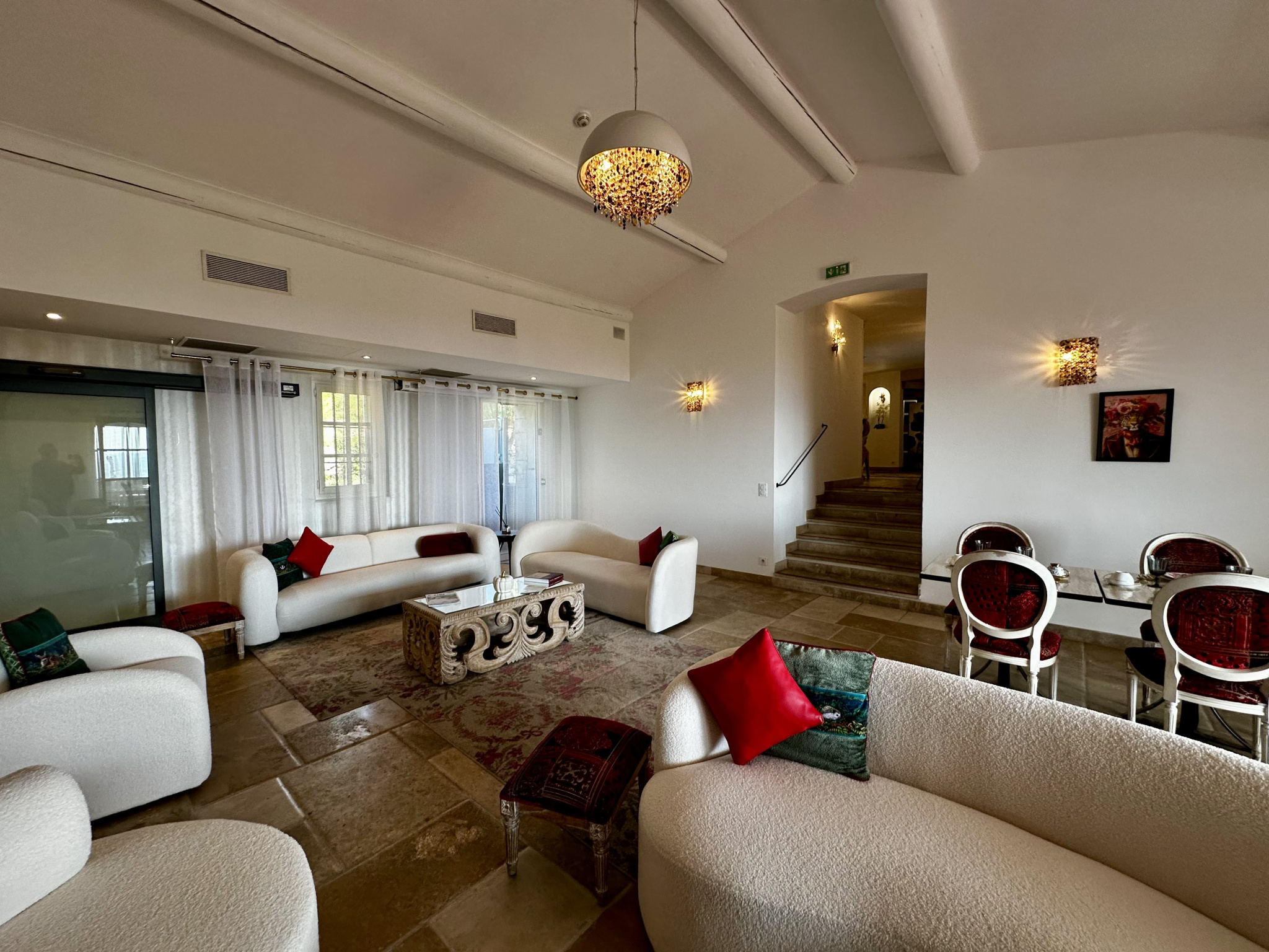 Spanning over 700 square meters, it comprises a reception area serving all wings of the house, a reception/dining room with a fireplace and a veranda with views, a fully equipped professional kitchen, a cinema room, a cafeteria, 17 bedrooms with private bathrooms, most with views, a nearly 2-hectare terraced parkland of oak and olive trees, a vegetable garden, and outbuildings.
