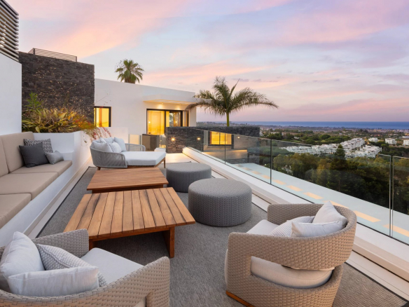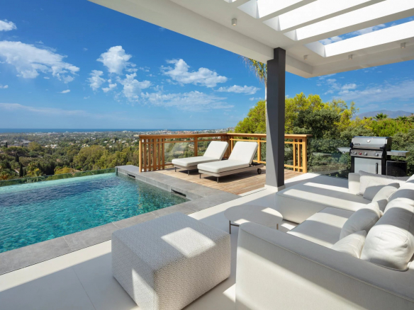 The terrace is thoughtfully designed for al fresco dining and relaxation, providing an ideal setting to enjoy Marbella's pleasant climate. The villa's southern orientation ensures abundant sunshine throughout the day, offering captivating sunrises and sunsets. An inviting zero-edge infinity pool adds to the appeal of the outdoor spaces.